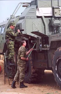 战勤人员在实弹射击前进行最后的检查。“打靶”日(通常是星期四)之前对军事装备进行定期技术维护工作。