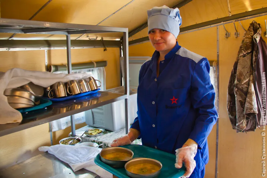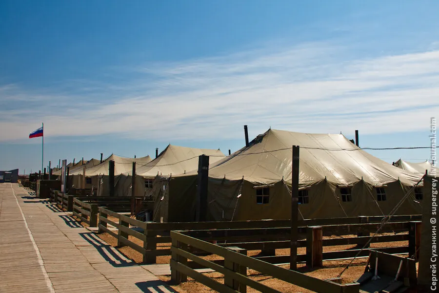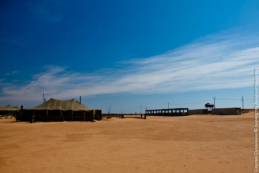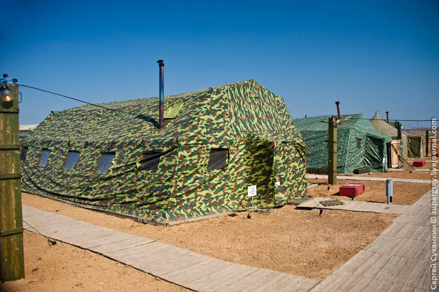 负责销毁弹药的部队驻扎在帐篷里。这是一个位于草原上的帐篷城,距离靶场有几公里。这支部队除了帐篷外,还有由一个个模块化单元组成的军营设施,模块化单元包括餐厅、厨房、仓库、电源和通信系统等。