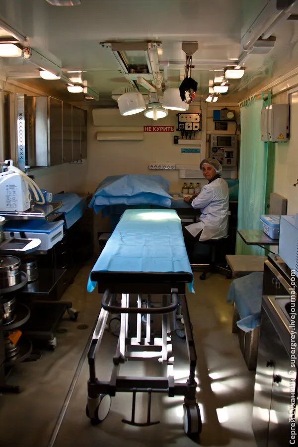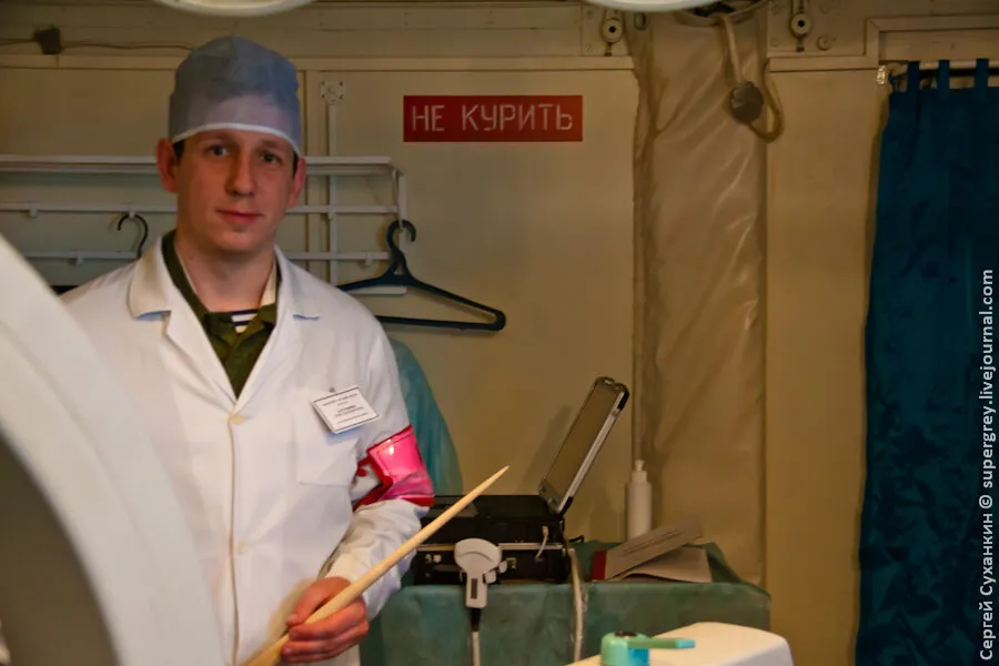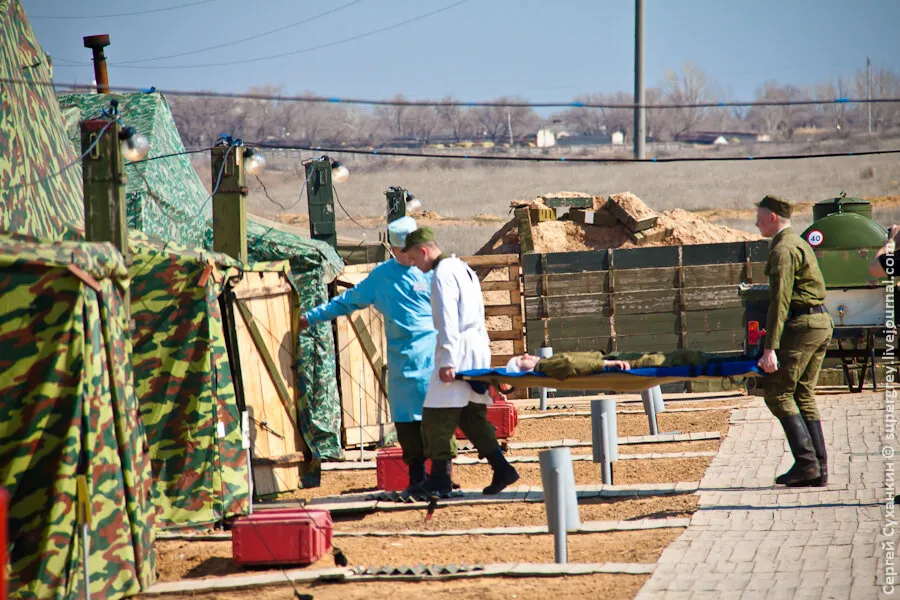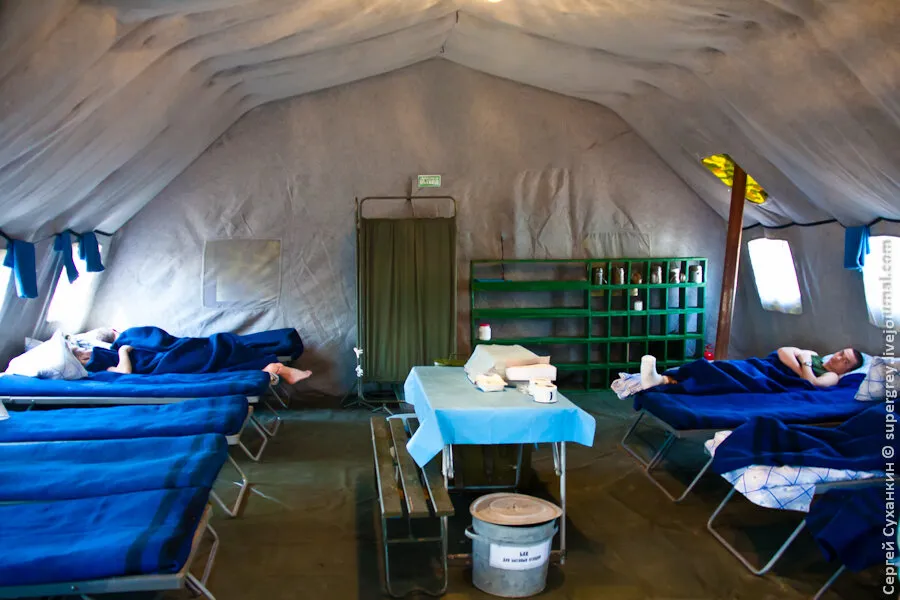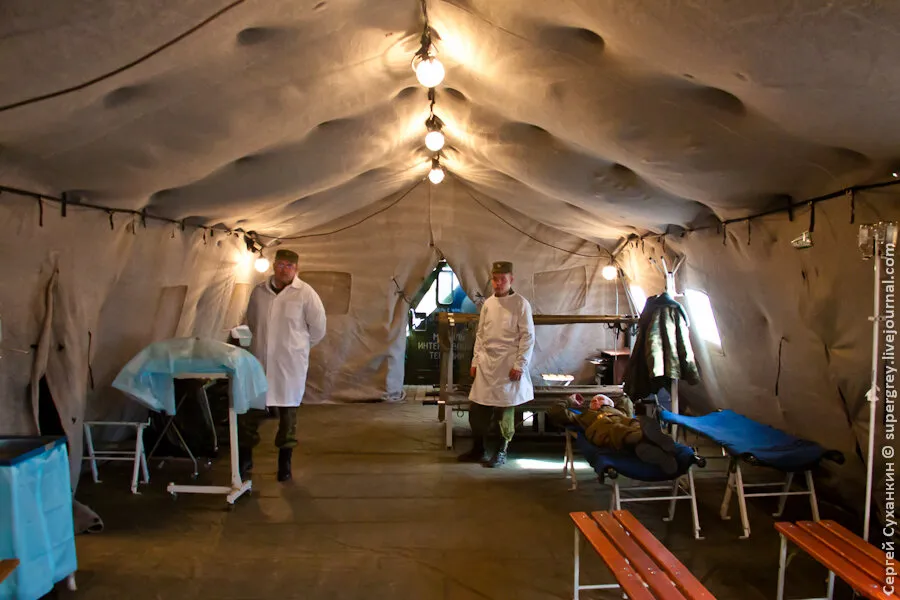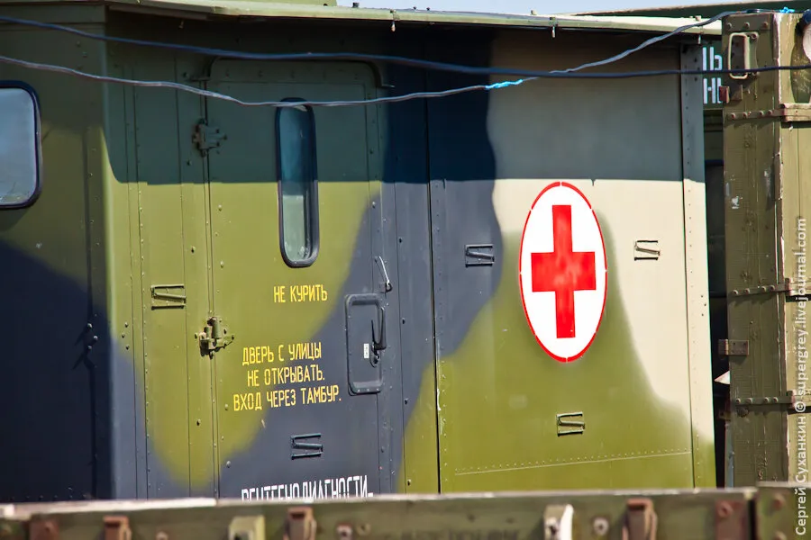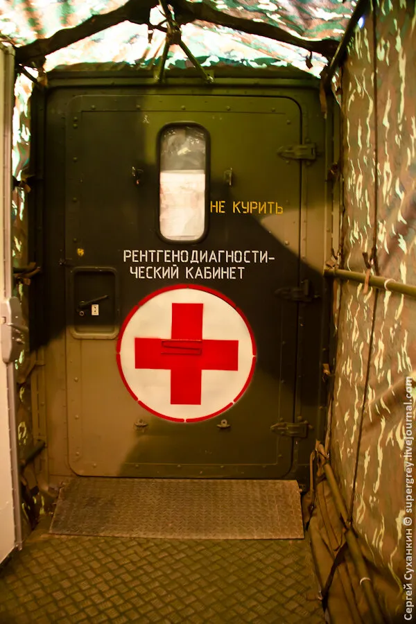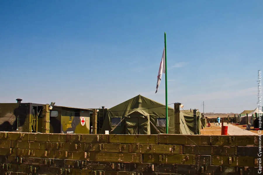 在靶场上还有一套俄罗斯军队的移动式医院。在俄罗斯,这样的移动式医院有4个,其中一个在马来西亚紧急情况期间被留下来救人。这样的移动式医院在茨欣瓦利的战斗中也是如此。