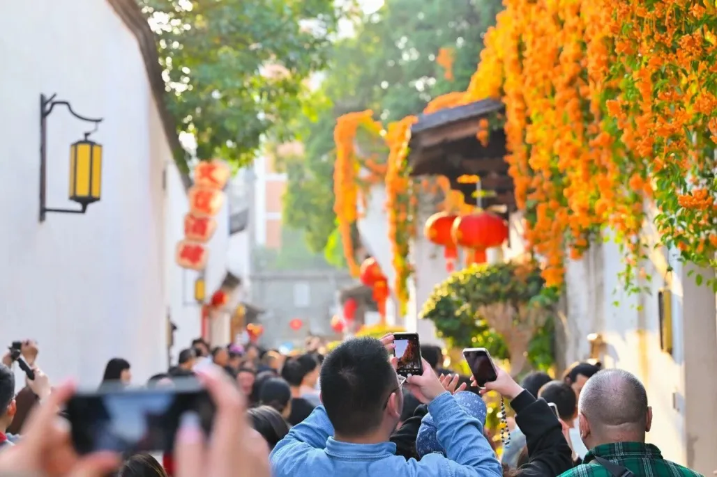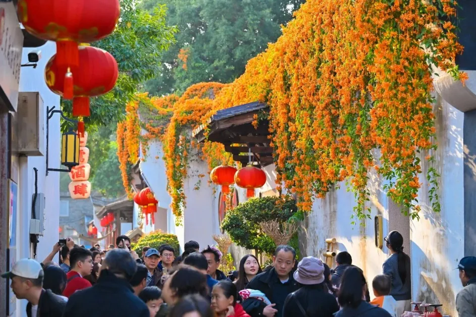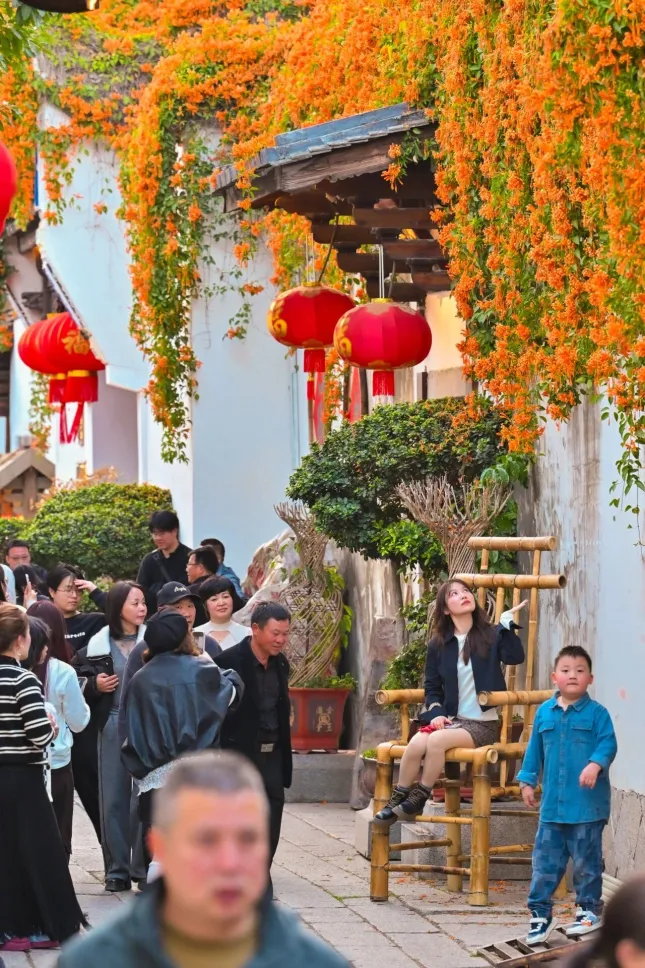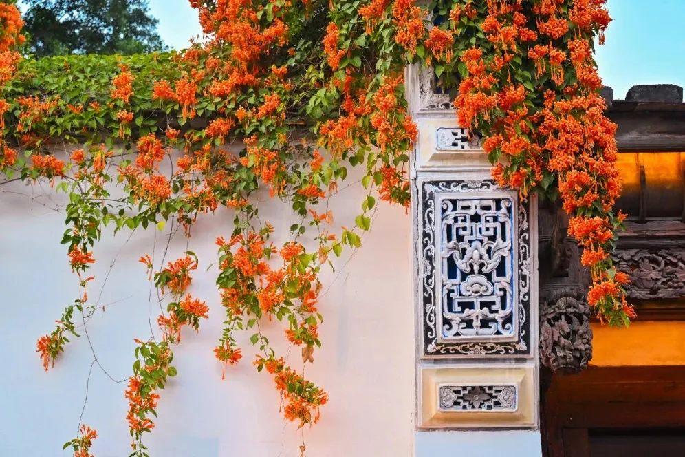 拍照贴士:低角度仰拍,古厝屋檐与橙红花瀑同框更出片,或近景拍花藤细节,氛围感拉满。