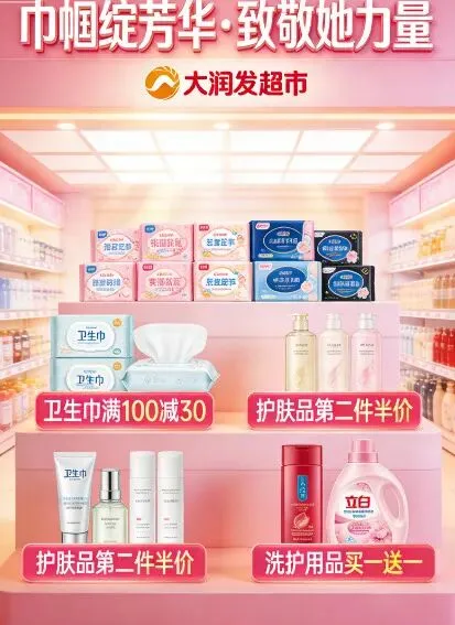 1.大润发超市:卫生巾宠粉大放送,3.8折起解锁贴心呵护;洁面、洁面巾、防晒、唇膏、手霜、身体乳5.9折起,轻松拿捏春日护肤仪式感;牙刷、沐浴露、香皂、洗手液6.9折起,实用好物性价比拉满;女士护肤品6.9折起,焕亮肌肤,不负芳华,让每一位女性都能以实惠价格,收获专属精致。