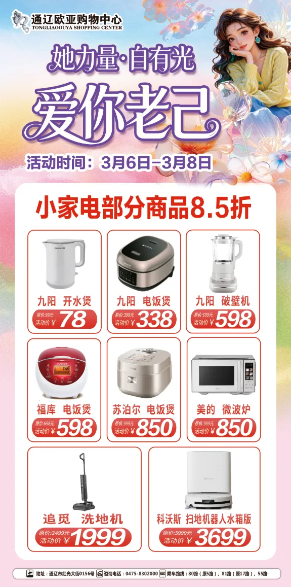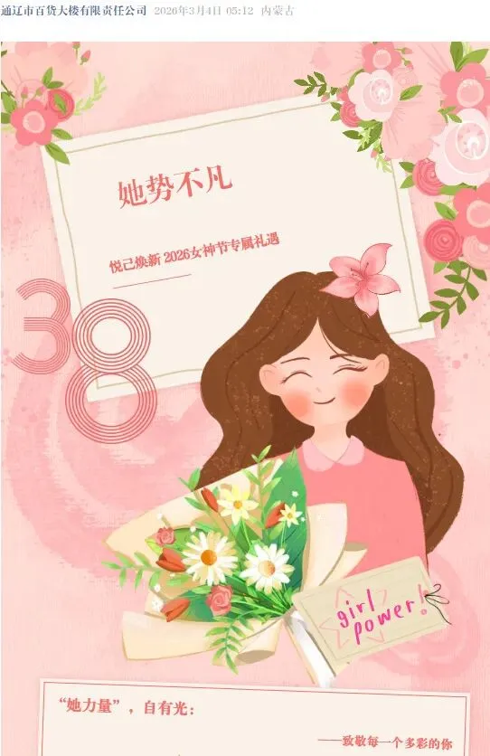 春风送暖,芳华绽放。在“三八”国际劳动妇女节来临之际,为致敬每一位了不起的“她”,激活春日消费活力,科尔沁区商务局精心联动辖区十大重点商家,重磅推出“三八”国际劳动妇女节促消费系列活动,涵盖商超、百货、家电、汽车等多个领域,用实打实的优惠、暖人心的福利,陪广大妇女度过一个悦己、舒心、实惠的专属节日,让“她力量”与春日消费热潮同频共振👏。