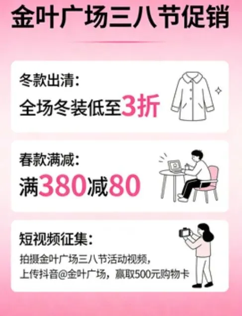 3.金叶广场:特惠商品、冬款出清商品及部分“三八”国际劳动妇女节专属促销商品,3.8——5折,清仓捡漏正当时;春款商品折后满200元再减38元,折后满600元再减138元,单笔消费满500元即可使用团购券,且仅限使用一张。会员专属福利升级:可登录金叶广场小程序,购买2000团2038元节日储值礼券,总量仅200张,手慢无!此外,3月1日线上已启动“我的悦己时刻”短视频主题征集活动,优质内容可在商场LED屏上展示,更有相应物质礼品鼓励,快来分享你的悦己瞬间。