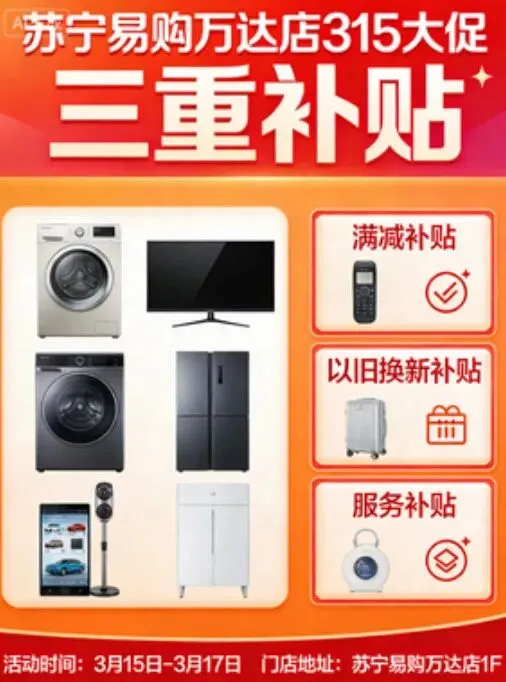 1.苏宁易购(万达店):“三八”国际劳动妇女节遇上3・15开年首场大促,福利翻倍!苏宁3・15享三重叠加补贴,国家补贴+苏宁补贴+工厂补贴,多重优惠叠加,家电数码抄底正当时,省心又省钱,解锁品质生活新体验。