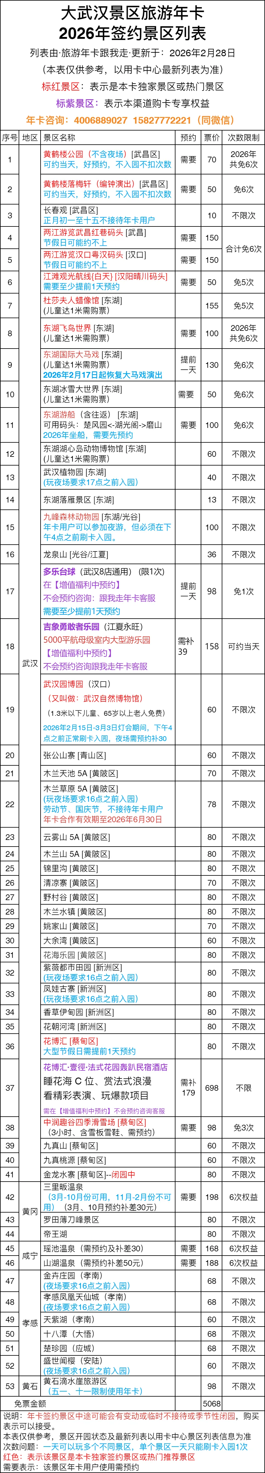 2026年大武汉景区旅游年卡定价200,有效期365天,合计签约50多家热门景区,含3家温泉、4个长江观光游轮码头可预约刷卡乘船、3个东湖游船码头可刷卡乘船、1个滑雪场