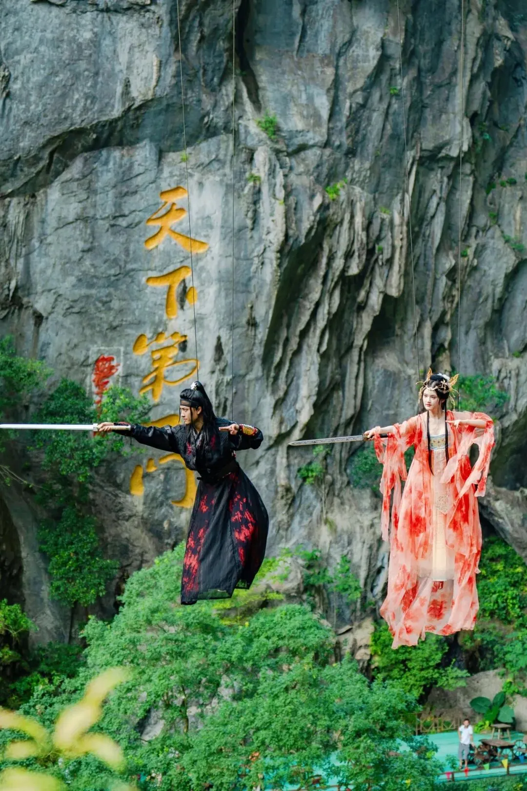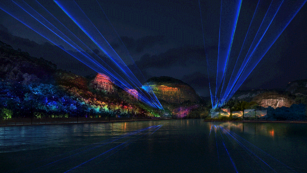 声光电在5公里山水间铺展,岭南画意、粤绣纹样在崖壁上流转,船行江心,仿佛驶入一幅流动的山水画卷。