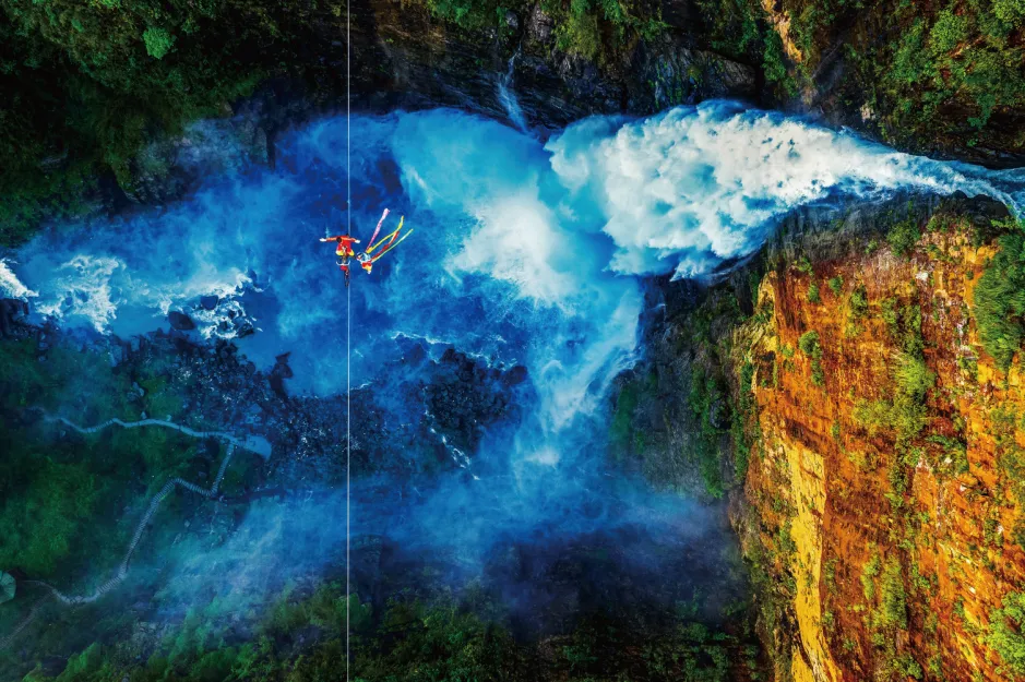 峡谷深处藏着不少惊喜——碧绿的水潭、赤红的崖壁,偶遇高空表演者在钢丝上走过峡谷,整座山谷都为之屏息。