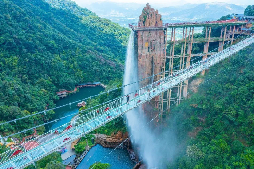 从谷口往下望,300多米深的裂谷横亘眼前,腾龙大瀑布从崖顶直泻而下,水声轰鸣。