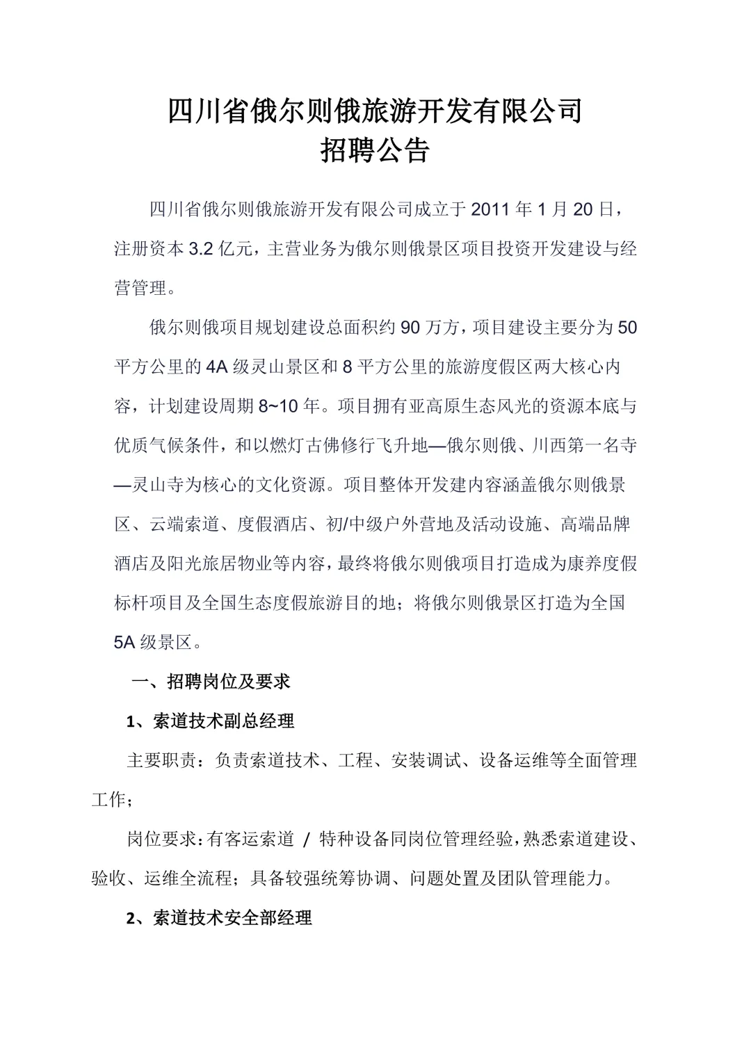 四川省俄尔则俄旅游开发有限公司招聘公告