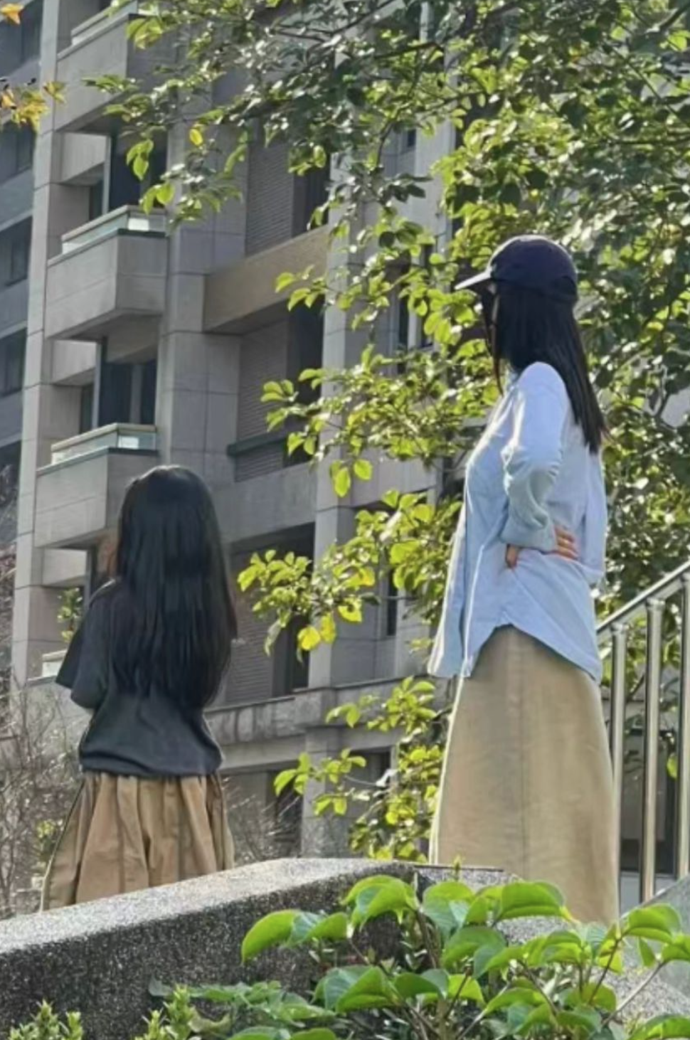 光看背影,Rhea跟高圆圆简直是复制粘贴,一头浓密及腰长发,搭配卡其色百褶裙,潮酷十足。