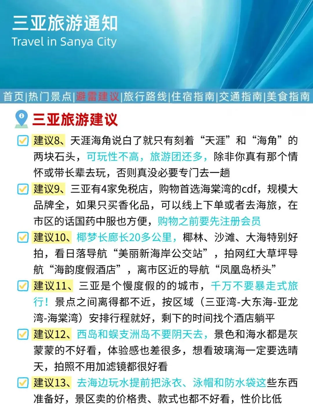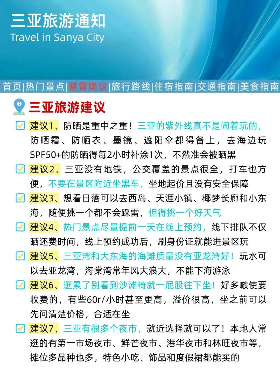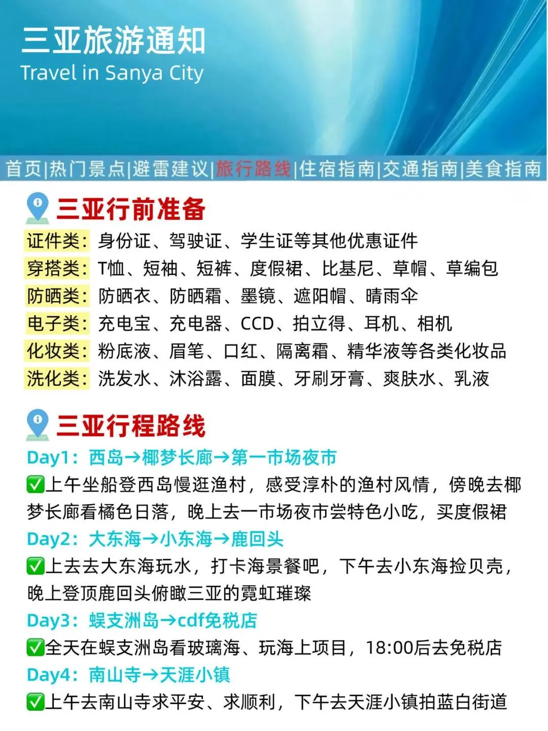 三亚4天3晚保姆级旅游攻略|避坑不踩雷,玩得尽兴又省心✨ 行前准备:这些东西一定要带• 证件类:身份证、学生证(部分景点可享优惠)、驾驶证(想自驾的话)。• 防晒类:SPF50+防晒霜(每2小时补涂)、防晒衣、墨镜、遮阳帽、晴雨伞,三亚的紫外线真的会“晒哭人”。• 穿搭类:T恤、短裤、度假裙、比基尼、草帽、草编包,轻便透气为主,方便随时下海玩水。• 其他:充电宝、相机/CCD、防水袋(装手机和证件)、泳衣泳帽(景区卖得又贵又丑)。