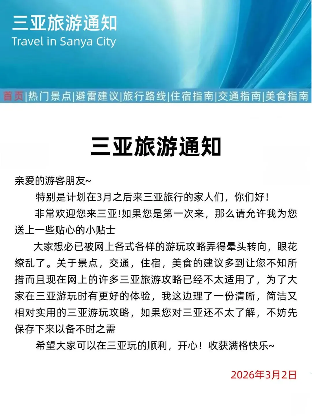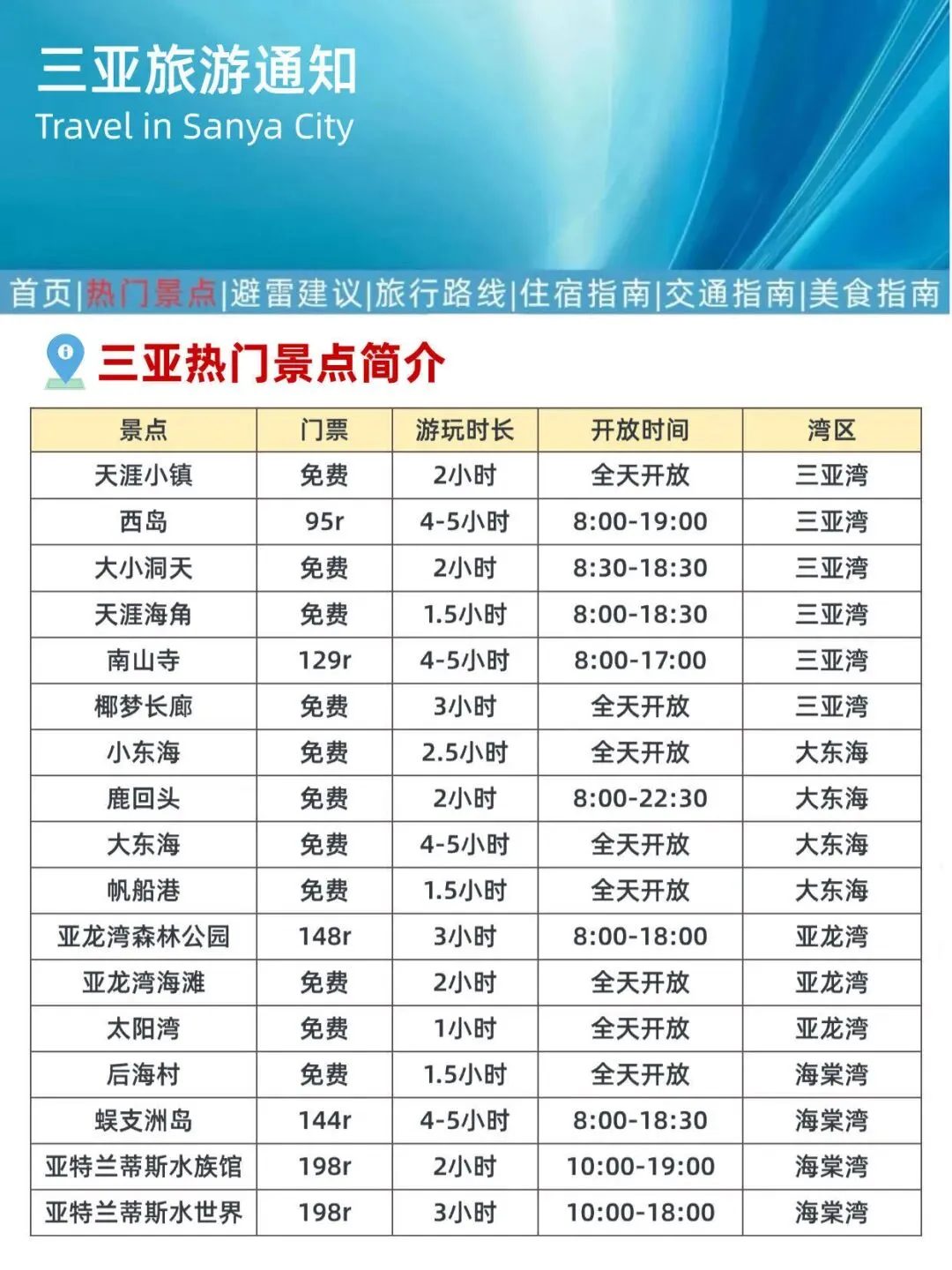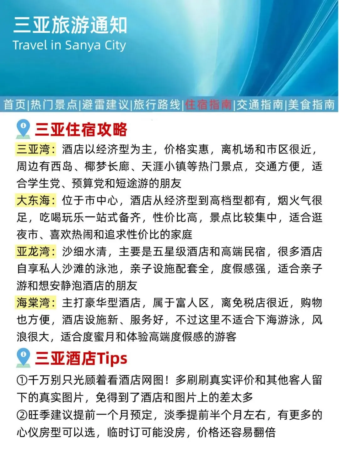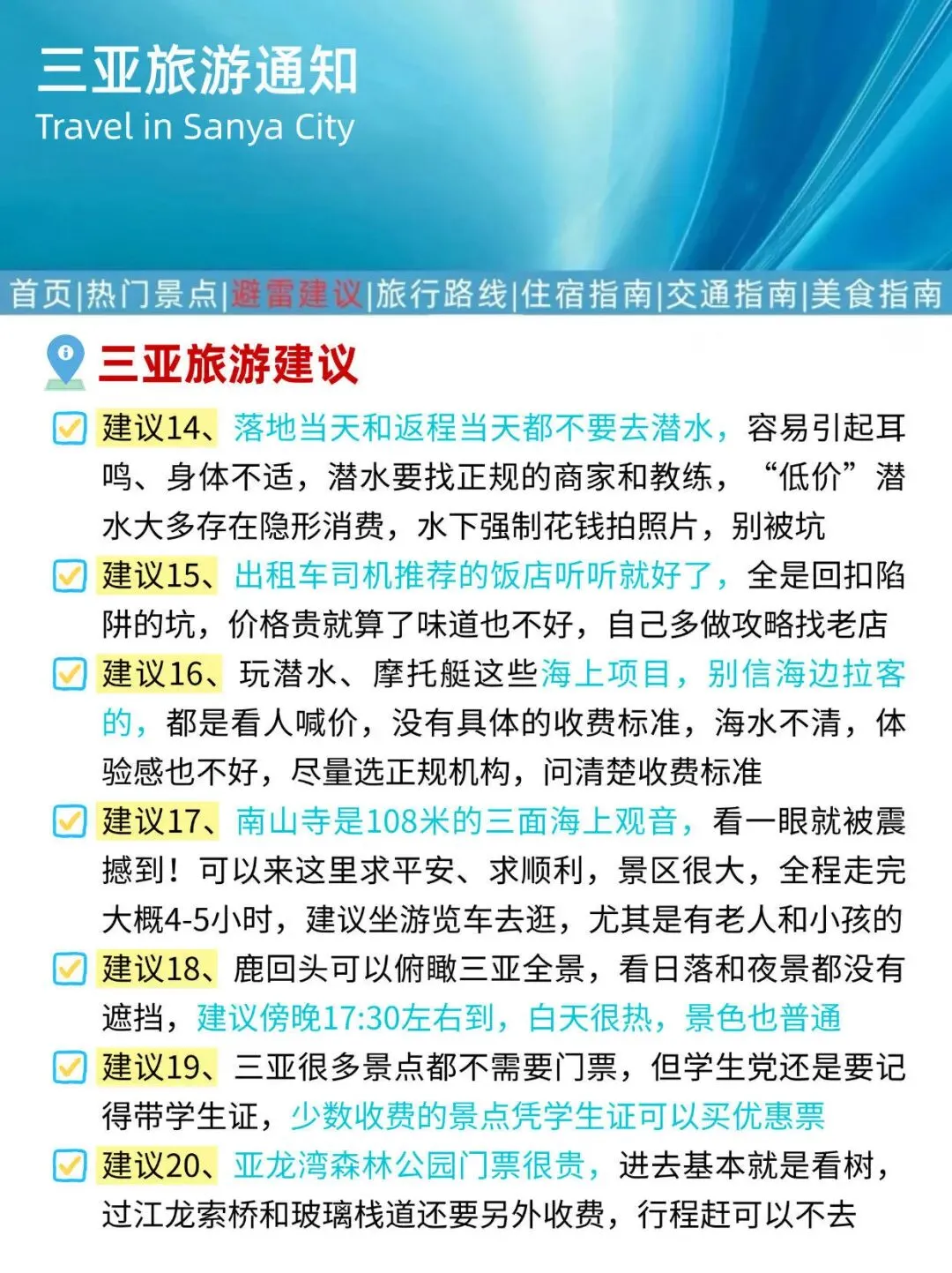 三亚4天3晚保姆级旅游攻略|避坑不踩雷,玩得尽兴又省心✨ 行前准备:这些东西一定要带• 证件类:身份证、学生证(部分景点可享优惠)、驾驶证(想自驾的话)。• 防晒类:SPF50+防晒霜(每2小时补涂)、防晒衣、墨镜、遮阳帽、晴雨伞,三亚的紫外线真的会“晒哭人”。• 穿搭类:T恤、短裤、度假裙、比基尼、草帽、草编包,轻便透气为主,方便随时下海玩水。• 其他:充电宝、相机/CCD、防水袋(装手机和证件)、泳衣泳帽(景区卖得又贵又丑)。