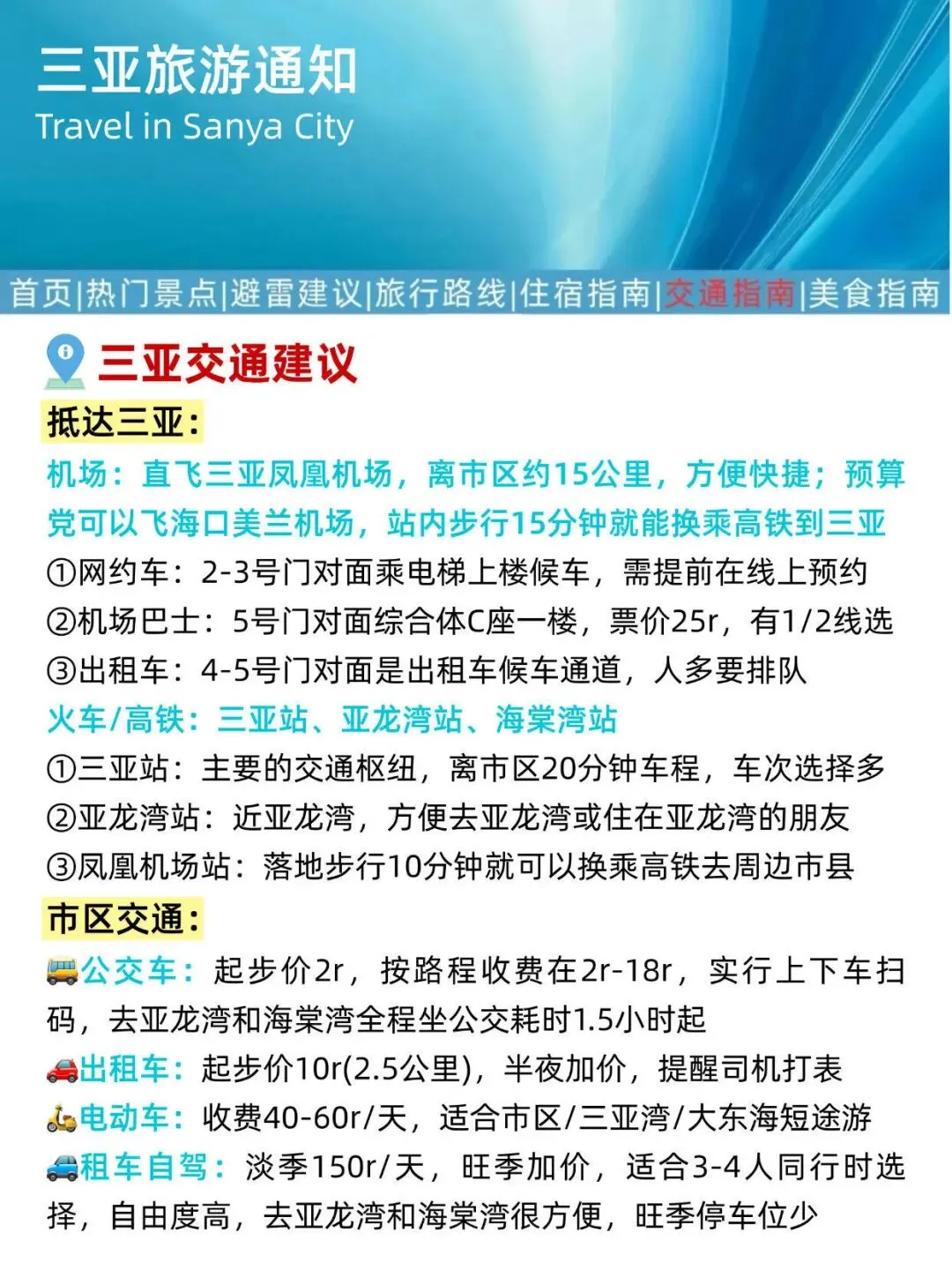🚗 交通建议:省钱又省心• 抵达三亚:直飞凤凰机场,离市区约15公里;预算党可飞海口美兰机场,换乘高铁到三亚更划算。网约车在2-3号门对面乘电梯上楼候车,需提前预约;机场巴士票价25元,有1/2线可选;出租车在4-5号门对面,人多要排队。市区交通: