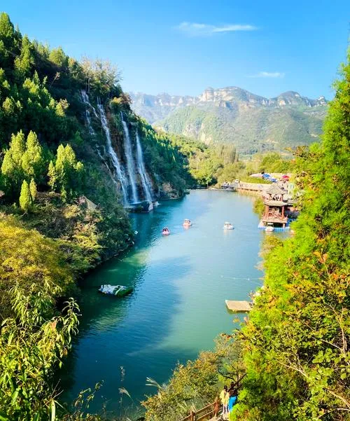 泰和山这个地方,核心就是黄花溪这条峡谷。很多人去了都说像九寨沟,这话不完全对,因为九寨沟是高原湖泊的清透,黄花溪是北方山涧的凌厉。水流从山上下来,冲击出一个个水潭,水质好到你站在岸边就能看到谷底的石头,关键是这水不是死水,是活水,一直在流。峡谷两边都是崖壁,夏天的时候崖壁上全是绿色植被,水声哗哗的,走在栈道上,那种凉意不是空调吹出来的,是山谷里自己带的。有一段路要踩着石头过溪,水流过你的脚面,那个瞬间你能感觉到这条溪水的脾气,它不温柔,但也不凶猛,就是该流就流的那股劲儿。