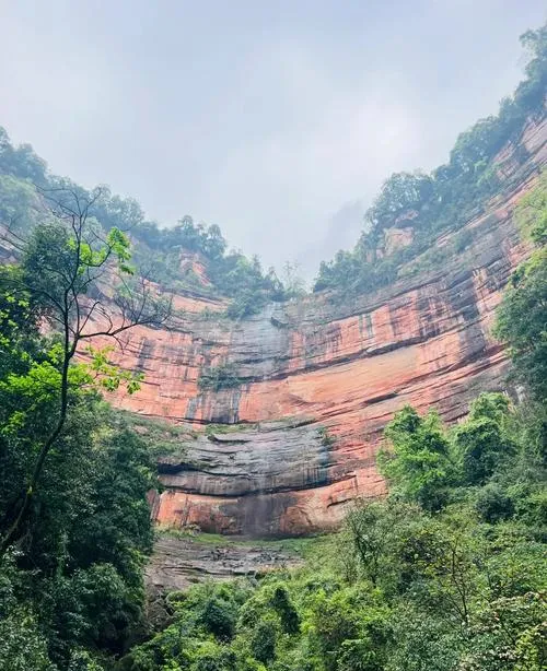 佛光岩是世界丹霞之冠,这个称号不是吹的,是真的站在那个地方你会明白为什么这么说。一整面弧形的红色崖壁,高度300多米,长度1000多米,像一面天然的红色屏风立在那,崖壁上有一条瀑布从顶上流下来,水量不大,但配合那个红色背景,有种说不出来的神性。