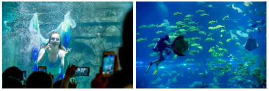 小朋友超期待的美人鱼表演!一群身姿曼妙的美人鱼小姐姐在水中翩翩起舞,