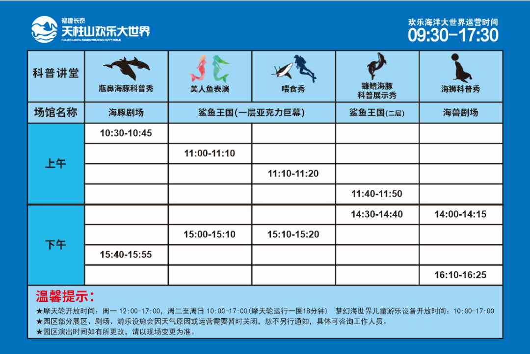 10:15前往海豚剧场观看瓶鼻海豚表演(上午10:30开始,表演时间视当天情况而定)。