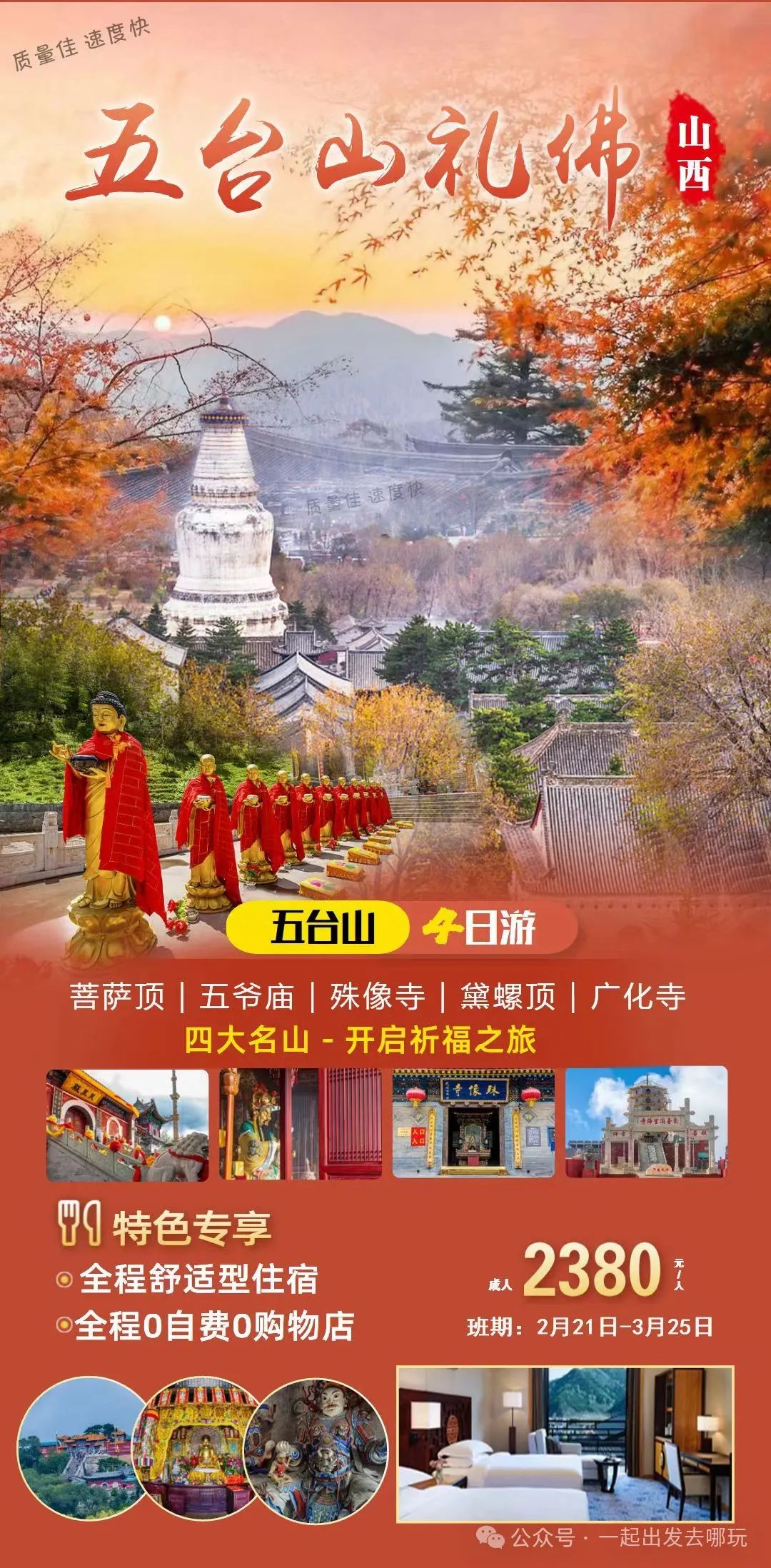 您现在的位置是:首页 > 国内旅游目的推荐 > 正文 国内旅游目的推荐 【畅游四省】湖南·贵州·湖北·重庆8日游 admin2024年02月25日 15:08:00国内旅游目的推荐133 一个让你朝思暮想神仙居住与人之间天堂的地方凤凰·醉美夜景行走古街道穿越到了千年的时光三峡·西陵峡览原汁原味的西陵峡自然风光,享受壮阔在胸的博大意境恩施女儿城中国的相亲之都原汁原味的土家熏制和吊脚楼布景让您身临其境感受浓郁的民族风情湖南·凤凰古城凤凰古城,国家历史文化名城称号湖南十大文化遗产之一曾被新西兰著名作家路易·艾黎称赞为中国最美丽的小城凤凰古城看古色古香的吊脚楼倒映沱江水中影影绰绰倒退着荡开圈圈涟漪还是在吊脚楼里凭栏看沱江缓缓青山依依,时光仿佛从沈从文笔下的《边城》悠然而来详细行程第一天萍乡/宜春/新余-武汉 餐:无 宿:武汉 以山水之名 ,开启一段美妙旅程!根据出发时间乘火车硬座抵达武汉 ,在列车上 欣赏祖国的大好河山!第二天武汉/武昌-宜昌-游西陵峡-女儿城 用餐:早餐 住宿:野山关早餐后 BUS 赴中国水电之都-宜昌 ,宜昌三斗坪码头上船 ,乘长江号(四星)豪华游轮 ,游览举 世闻名的国家 AAAAA【长江三峡】 ,船过葛洲坝升降船闸 ,观【葛洲坝水利枢纽工程全貌】尽揽世 界顶级旅游风景区长江三峡精华段核心区---【西陵峡原始峡谷风光】。三峡库区 175 米的最终水位, 改变了瞿塘峡、巫峡的景观,惟有三峡大坝下游 38 公里的西陵峡没有被淹没。天然画廊”风采依旧, 雄、秀、奇、幽自然风貌依存 ,西陵峡峡口也是长江三峡里面唯一一个可以看到老三峡原汁原味的地方了。第三天梭布垭-太平山-太平山篝火 用餐:早晚餐 住宿:太平山早餐后乘 BUS 游览天下名城【恩施女儿城】恩施女儿会也叫土家女儿会, 被誉为东方情人节或土家情人节 ,女儿会是恩施州土家族具有代表性的区域性民族传统节日之一。前往梭布垭风景区位于恩施市太阳河乡境内 ,梭布垭总面积 21 平方公里 ,梭布垭是省级重点旅 游景点。梭布是土家语三个的意思 ,梭布垭即三个垭。梭布垭景区平均海拔 900 多米 ,梭布垭属亚 热带季风湿润气候 ,冬无严寒,夏无酷暑 ,植被良好 ,动物资源丰富 , 自然景色迷人,梭布垭被誉为 “戴冠石林”、“天然氧吧”。整个梭布垭风景区若一只巨大的葫芦,梭布垭四周翠屏环绕,群峰锦 绣。梭布垭共八个景区, 100 多个景点,依次为:古柏民俗乐园、青龙寺、六步关、莲花寨、宝塔岩、 磨子沟、锦绣谷、梨子坪等 ,这八景之中 ,遍布奇峰怪石 ,有的形若苍鹰望日 ,有的神似仙女回眸, 有的恰似龙争虎斗,有的酷肖莲花朵朵,有的婀娜多姿,有的峥嵘雄奇 ,千般姿态 ,万种风情,令人叹为观止。后乘车赴【太平山】太平山雄奇险峻 ,其山顶终年云缠雾绕 ,仅一条石径小路可攀 ,路旁铁链护栏。沿途设三道山门, 山顶建有寺庙一座 ,始于清道光六年 ,鼎盛时有 300 多个和尚常住,传说该寺第五代主持宏松禅师云游京城时 ,曾为光绪皇帝治愈奇险之疾“背花” ,受到封赐奖赏 ,回 太平山后修建了藏经楼、观音阁等 ,使太平山名扬天下。二十年代末 ,我国著名政治活动家章太炎先 生曾到太平山一游,对其大加赞赏,欣然命笔:“太平山层峦叠篝火晚会。翠,林木葱茏 ,山峰险秀,殿阁凌云,风景优美 ,不亚于庐山雁荡”。晚上举行篝火晚会。第四天不二温泉森林酒店-不二温泉-72奇楼远观夜景用餐:早晚餐 住宿:武陵源早餐后从太平山前往不二门风景区是一座国家级森林公园(二 00 六年八月三十一 日 ,经国家林业局批准 ,成为首批获得中国国家森林公园专用标志使用授权的国家级森林公园) ,湖南省有名胜景。风景区位于县城南 1.5 公里的猛洞河畔 ,总面积达 30 平方公里,是猛洞河风景区的北大门。以石奇、 温泉、石刻、观音朝拜为其特色。石灰岩溶蚀而成的不二石门、莲花池、八阵图被视为大自然的鬼斧 神工。 一笔呵成的"山青海岸"四个字合成一个"岸"字的石刻、有迷魂镇之称的八阵图令人惊叹不已。 这里一年四季苍翠葱茏 ,梵声缭绕 ,是修身养性的好地方。《乌龙山剿匪记》、与《相西剿匪记》均 在此拍摄。不二门取自佛家"不二法门"之意 ,正门的右壁上有沈从文先生题写的"石门天凿"四字 ,为 沈先生生前最后一次回乡时题写。不二门温泉以温泉“ +康养”、“ +创新”、“ +休闲”、“ +娱乐”、 “ +餐饮”为创新理念 ,以“湘西第一泉”的天然石林为资源核心 ,结合土家族礼佛沐浴养生的文化 脉络 ,打造出 “土司话禅境 ,石林悬秘汤”的养生意境。后前往张家界远观七十二奇楼夜景。从远处看 ,七十二奇楼就像是一座悬浮在半空中的土家山寨 ,虚虚实实 ,如在幻境中一般。第五天超市-天门山用餐:早餐 住宿:武陵源早餐后参观当地大型土特产超市,后游览国家 游览天门山国家公园天门山文化底蕴深厚,有“武 陵之魂”之称,更有湘西第一神山的美誉 ,它兼峰、石、泉、溪、云、林于一体,集雄、奇、秀、险、 幽于一身 ,被誉为空中原始花园。我们乘坐天门山索道 ,前往游览天门山:观天门洞、99道弯公路奇观(通天大道)、李娜别墅、鬼谷栈道、鬼谷兵盘、云梦仙顶、天门山寺、灵泉院、木石之恋等著名景点。【天门索道】:索道线路斜长7455米 ,上、下站水平高差1279米,是世界最长的单线循环脱挂抱索 器车厢式索道 ,犹如一道彩虹飞渡