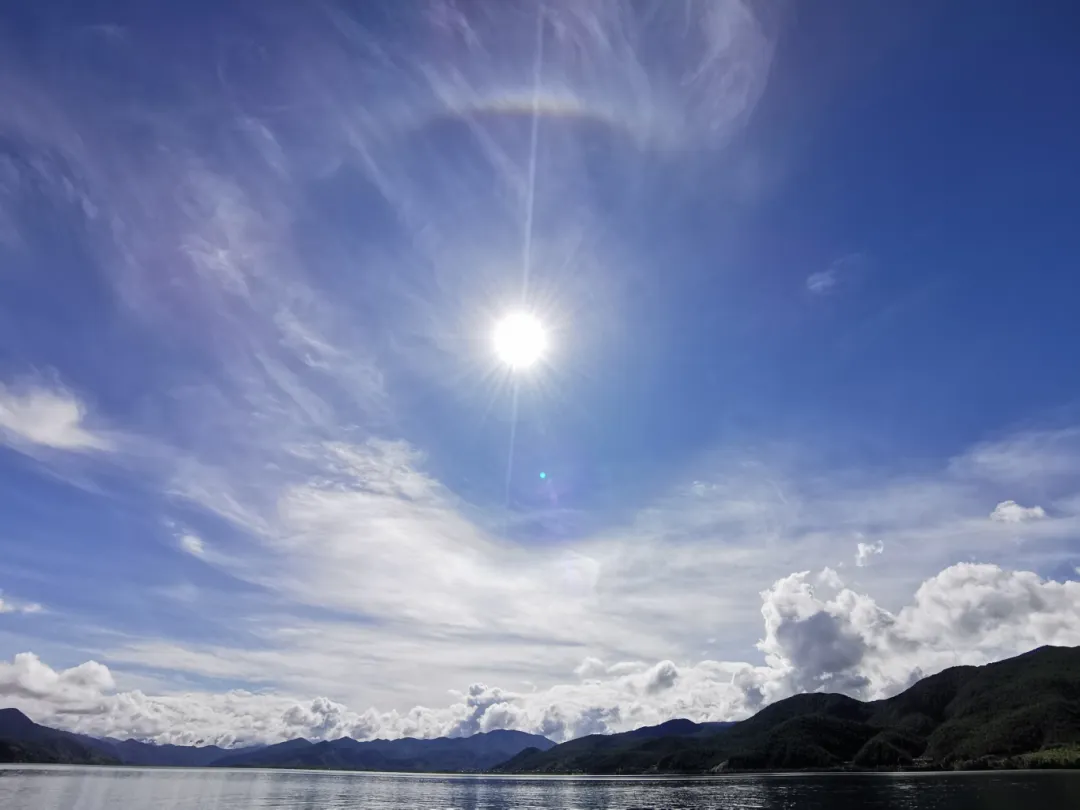 8月5日早上原计划去湖边看日出,但早上6点起来,天正在下雨,下得还不小,于是只好放弃。吃完早饭8点半出发时,天已晴朗,蓝天白云,绝好的一个游览日。我们乘船在泸沽湖中游览,快到湖中小岛的时候,发现湖面上有雾。夫人说是观音菩萨加持的雾,雾里有大悲水,一是加持湖里的水族,二是加持我们。从湖中小岛返回时,突然发现天空中太阳周围出现了一圈佛光,大家知道,一定是菩萨示现。回到岸上,我们感恩佛菩萨慈悲,又共修了17遍大悲咒,然后与佛光圈合影留念。夫人说,是观音菩萨示现的。佛祖、观音菩萨、韦陀菩萨、地藏王菩萨来到了泸沽湖,和我们一起游玩。我们离开泸沽湖,佛菩萨便也离开了。