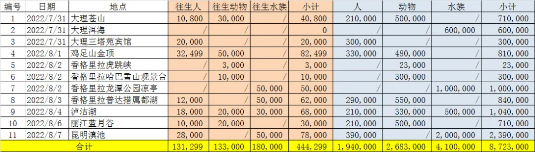 此次云南之旅,在旅游的同时,我们走到哪里大悲咒念到哪里,努力做到一切时一切处都在持诵大悲咒。据统计,共超度444299众生,其中人131299,动物133000,水族180000,佛菩萨一共示现6次,非常殊胜。