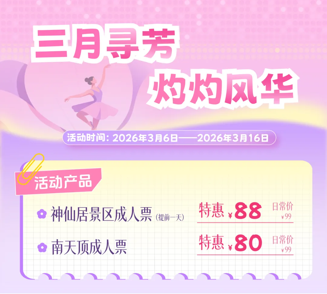 3月6日-3月16日,神仙居景区成人票特惠88元,南天顶成人票特惠80元。入园还送您花环。