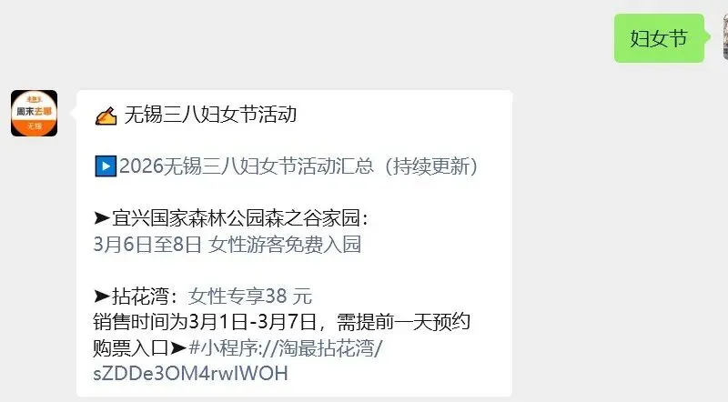 小编提醒:点击下方进入【无锡周末去哪】公众号,在对话框回复【妇女节】快速获取无锡妇女节活动攻略、景区活动等信息