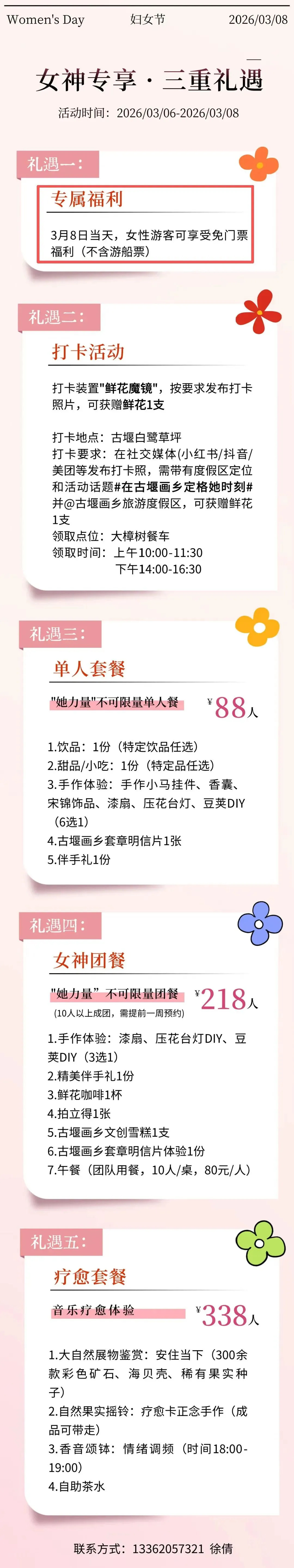3月8日当天,女性游客入住东西岩酒店可享88折优惠。预订热线:0578-2702299
