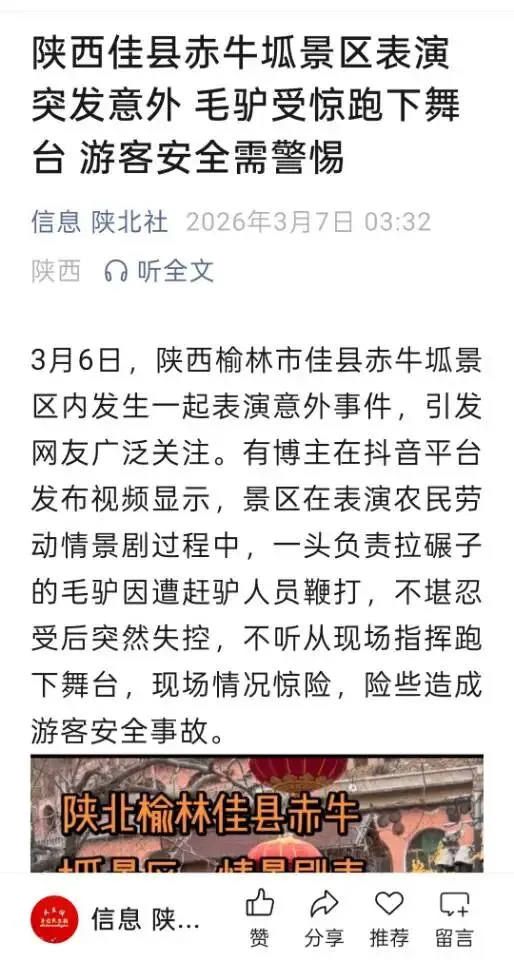 3月6日,陕西佳县赤牛坬景区农耕情景剧表演中,一头毛驴因遭鞭打应激失控,冲下舞台的惊险一幕,让无数网友捏了一把汗。万幸此次未造成人员伤亡,但这起意外绝非偶然,它撕开了景区动物表演安全管理的漏洞,也让动物福利与游客安全的双重议题,再次摆在公众面前。