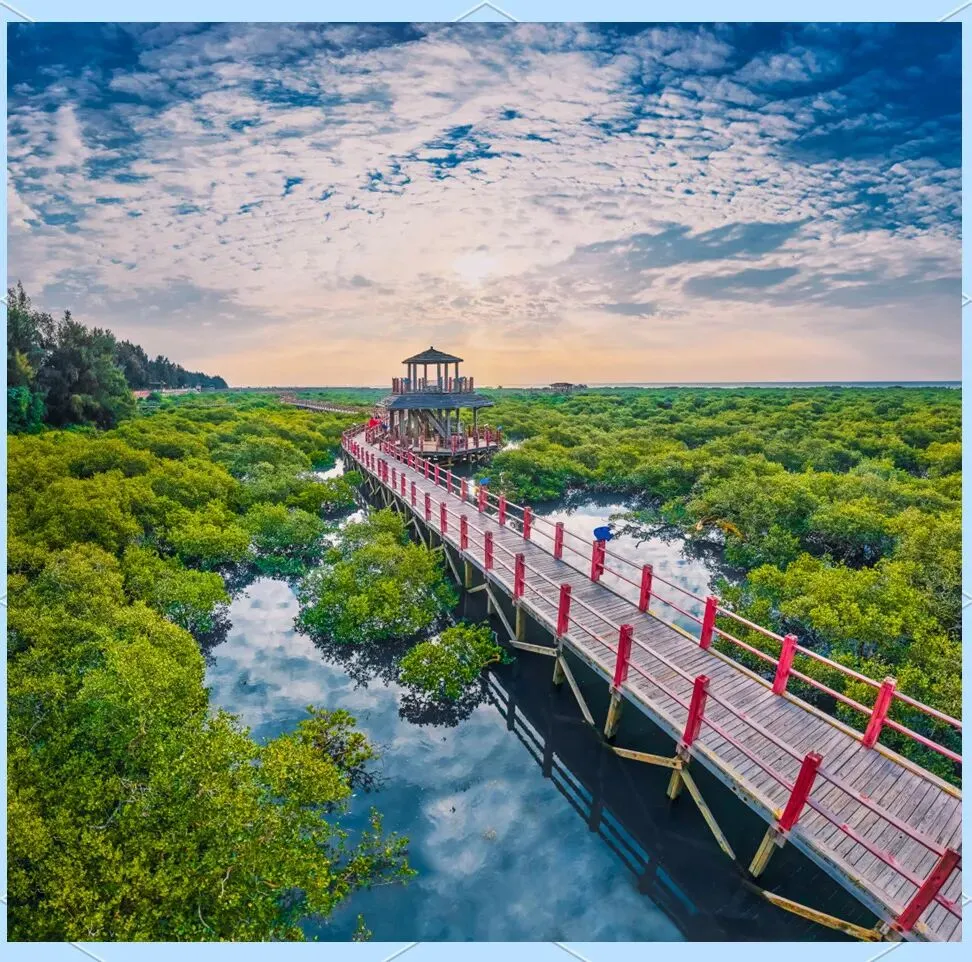 2.北海金海湾红树林:北海金海湾红树林生态旅游区是我国极富滨海湿地风情和疍家民俗文化的景区,位于北海市区东南端,距离市中心(北部湾广场)约15公里,距离银滩旅游区约5.9公里。景区面积6000亩,由门景区、红树林生态观光区和疍家民俗园区等三部分组成。