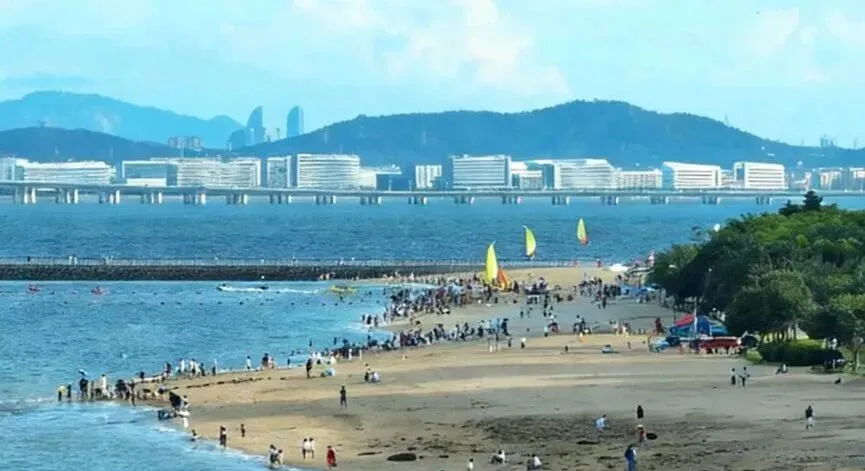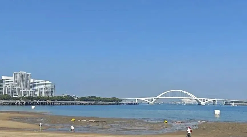 五缘湾沙滩,五缘湾重要组成部分,位于五缘湾大桥附近,与五缘湾湿地公园相连。厦门岛内小众沙滩,游客较少,环境清净,主打水上运动和休闲氛围。沙子细腻平坦,海水清澈见底,海滨浴场和水上运动场所。可享受阳光、沙滩、海浪,参与帆船、帆板、皮划艇、摩托艇等水上运动项目。绝佳赶海地点,退潮时沙滩上有花蛤、小螃蟹、贝壳等。提前查看厦门潮汐表,退潮时前来。周边还有五缘湾湿地公园、五缘湾游艇码头、五缘湾大桥等景点。