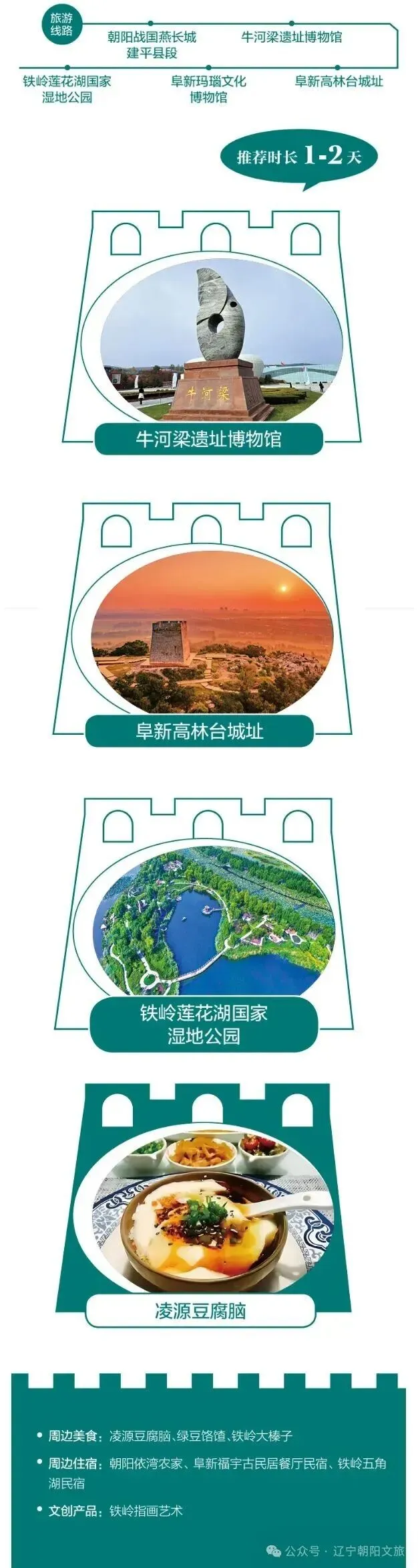 辽韵匠魂,遗火永续。这条线路堪称一场穿越辽西北的“非遗匠心”之旅。从朝阳战国燕长城建平县段与朝阳牛河梁遗址沉淀的历史痕迹,到建平剪纸指尖流淌的北方民俗质朴与灵动,还有朝阳南园酒店非遗美食“扒猪脸”的软糯浓香。一路融汇历史遗迹、民间美术、饮食文化、工艺瑰宝,是一场跨越时空,深度体验关东文化魂与韵的精华之旅。该线路起点为朝阳战国燕长城建平县段、牛河梁遗址博物馆、铁岭莲花湖国家湿地公园、阜新玛瑙文化博物馆至阜新高林台城址。美食有凌源豆腐脑、绿豆饹馇等,住宿有喀喇沁左翼蒙古族自治县依湾农家等。推荐时长为1至2天。