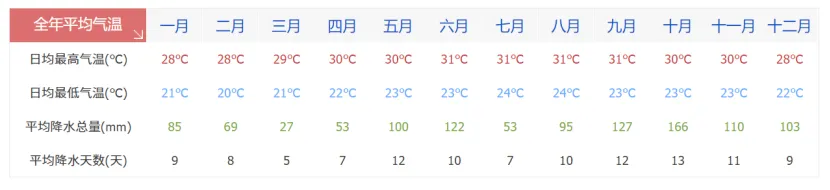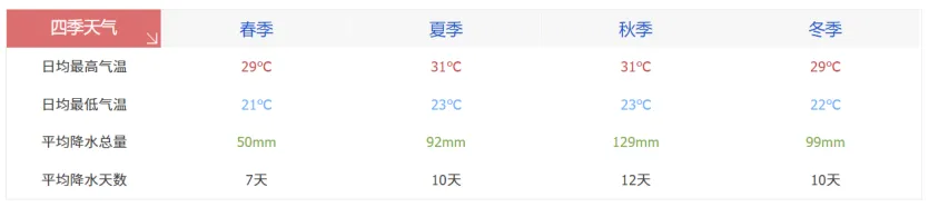 蒙特哥贝为热带气候,全年温暖湿润,降水分布不均,具有明显的干湿季特征。每年5—6月、9—11月为雨季,其中6月和10月降水最多,最高月均降水量达到166mm。12月至次年3月为干旱季节,天气转凉。6—11月底的半年时间为飓风和热带风暴多发期。