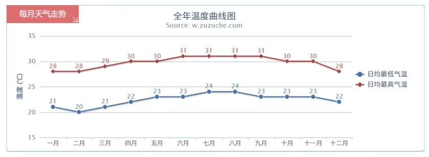 蒙特哥贝全年持续炎热,高温的月平均气温在28°C和31°C之间波动,低温在20°C和24°C之间波动。
