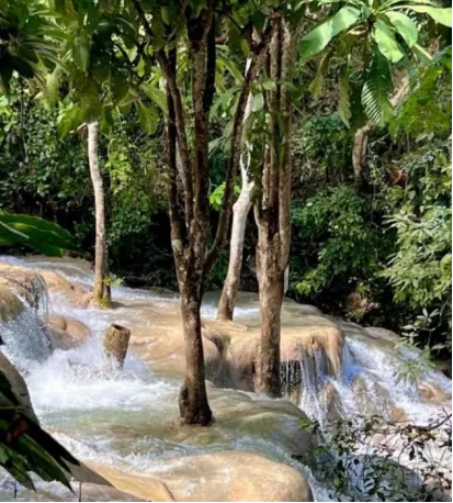 邓恩河瀑布公园位于牙买加北部海岸的中段,是加勒比海唯一的临海瀑布。邓斯河呈阶梯叠水式的瀑布,适合攀爬。虽然岩石的表层光滑平整,但水流并不十分湍急,深浅正好没过人的腰部。牙买加人充分利用这一自然优势,将其开发为可供游客逆水攀爬的户外运动景点,每天从世界各地来此攀爬者数不胜数。