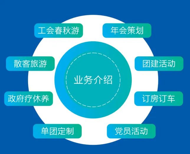 职工疗休养、职工春秋游、学生春秋游|研学、企业团建、工会活动、党员活动、企业公务、订房订餐订车、单团定制、康养活动、散客私人定制等。