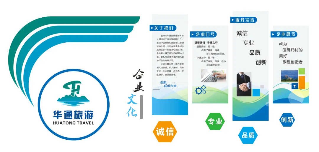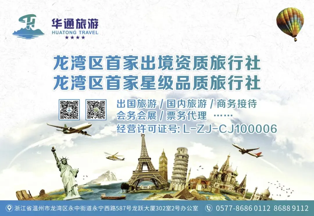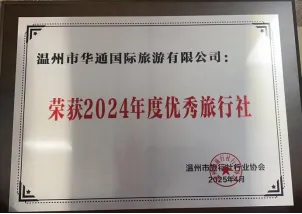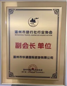 温州市华通国际旅游有限公司是浙江省四星级品质旅行社,成立于2003年4月,是经国家注册的有出入境资质旅游公司,公司坐落于温州市龙湾区永中街道永宁西路587号龙跃大厦302室2号办公室(龙湾建设总部大厦),是龙湾本土旅游行业领先的一家老牌公司,并担任温州市旅行社行业协会副会长单位、温州市研学分会会长单位、长三角一体化旅游联盟研学旅行专委会会员单位、中国八方文化旅游联合体理事单位、温州市管件行业协会理事单位、温州市龙湾区永中商会理事单位、温州市龙湾区锻压行业协会理事单位、温州市微爱发展中心理事单位等。在行业内外地位稳固、认可度较高;经营期间屡获社会各界肯定,公司曾多次被评为市、区级诚信旅行社、平安旅行社、先进优秀旅行社、环保先进单位等;并经常收到疗休养合作单位及各类客户的表扬信、锦旗,行业口碑与社会美誉度持续领先。