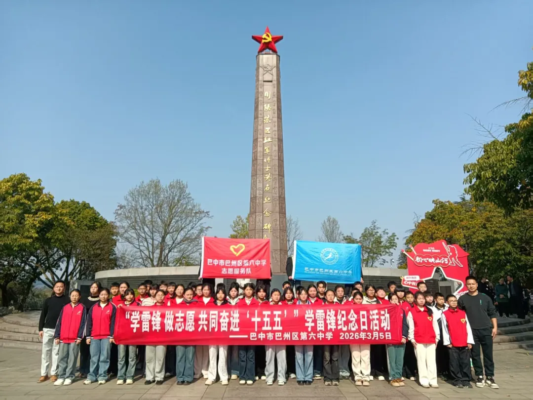 三月春风拂大地,雷锋精神永相传。2026年3月5日,巴中市巴州区第六中学组织青年志愿者服务队,走进南龛山景区开展“学雷锋 做志愿 共同奋进‘十五五’”主题志愿服务活动,以实际行动传承和弘扬雷锋精神。