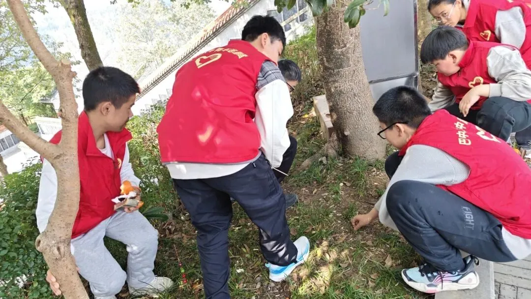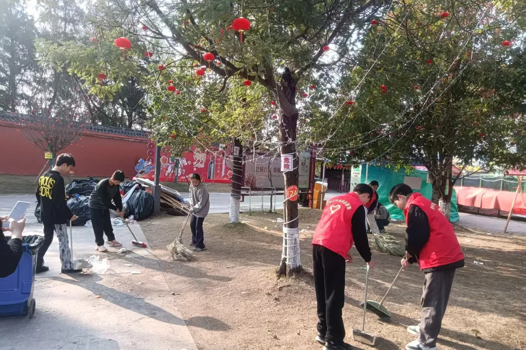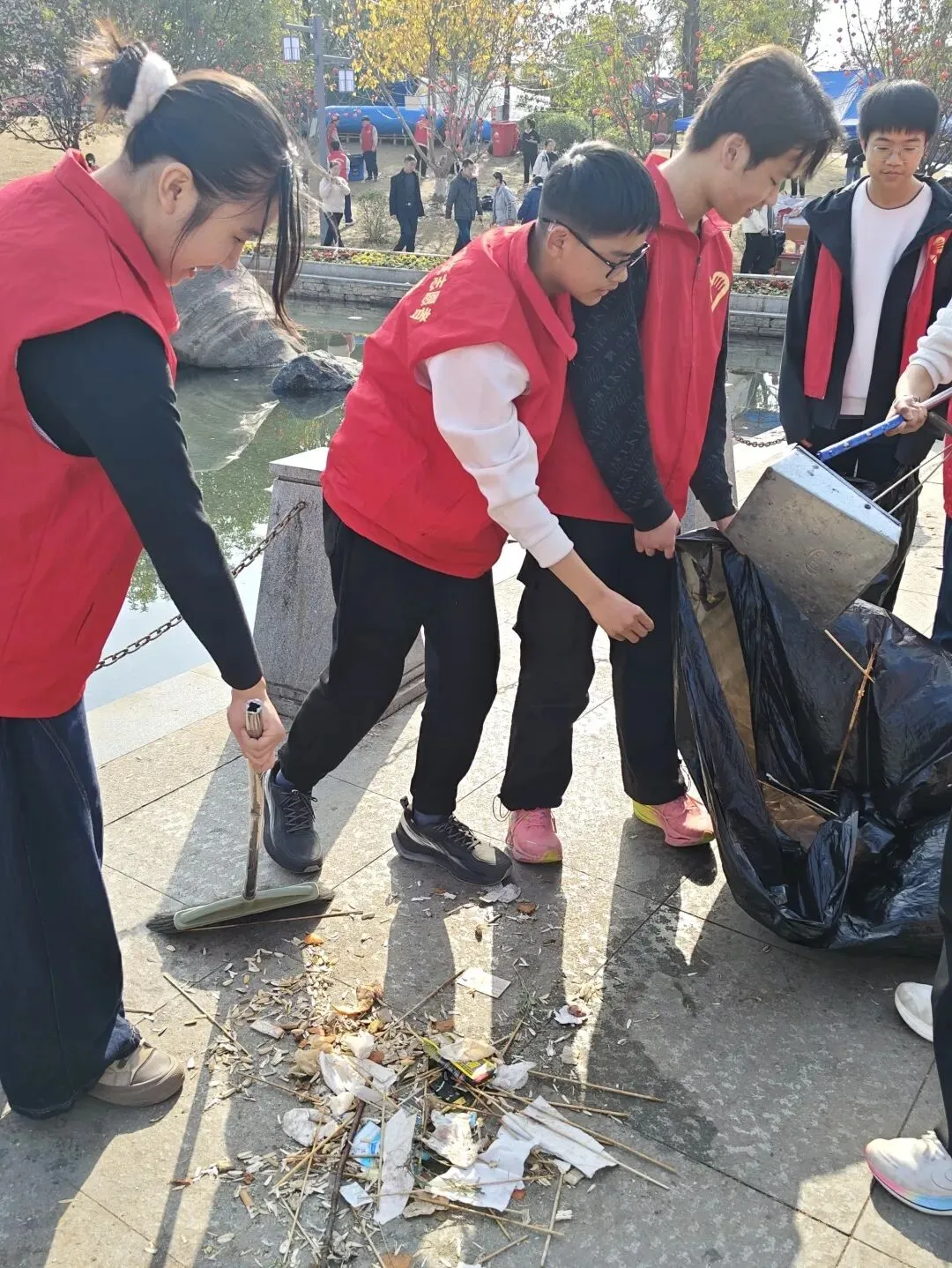 活动现场,身着红色志愿马甲的同学们精神饱满、分工协作。大家手持扫帚、铁铲、垃圾袋等工具,对景区步道、绿化带、纪念碑周边等区域开展全面清扫活动:有的弯腰捡拾草丛中的烟头、纸屑,有的仔细清扫路面落叶与垃圾,有的合力将装满的垃圾袋集中搬运至指定投放点。从石阶缝隙到湖边角落,志愿者们不放过任何一处卫生死角,用双手还原景区的整洁风貌,成为春日里一道温暖的风景线。