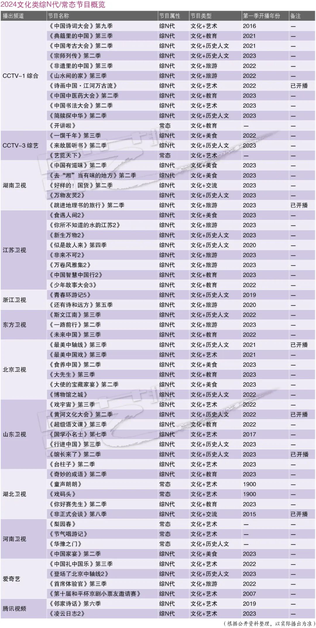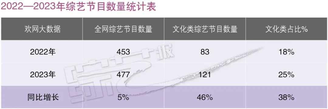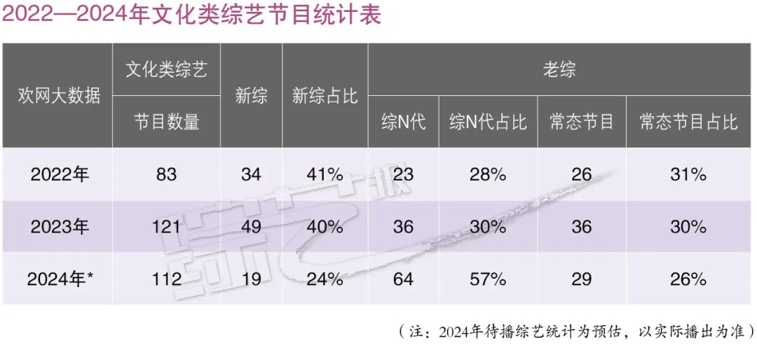 综艺与地域文化日益融合,既实现了对文化类节目内容同质化现象的突破,也起到推进地域文化活化、城乡形象传播、文化自信自强的作用。2023年排名浙江卫视文化类节目TOP1的《青春环游记》,2024年第五季将继续通过嘉宾结伴出行的方式,讲述不同城市的历史人文,重磅明星嘉宾阵容也是大众兴趣焦点和热议话题。浙江卫视2024年新综《遥远的相似》以丝绸之路古文明为入口,探访“国潮”对当地的影响,引领观众感受不同地域文化。芒果TV去年播出了益智文化游学节目 《跳进地理书的旅行》,今年,《跳进地理书的旅行》第二季原班人马聚齐,在“读万卷书”的同时“行万里路”,实地打卡“地理教科书”中的美景,节目生动有趣,输出意想不到的知识点。与文学作品互融是加深文旅节目探讨深度的一大创新方向。江苏卫视去年播出的文化综艺《我在岛屿读书》豆瓣评分超9分;2024年,《我在旅途读书》将作为《我在岛屿读书》的姐妹篇推出,节目增加了旅游元素,观众将跟随作家余华、莫言、西川、苏童等进行一段文化之旅。北京卫视将推出“文化+旅游”融合新综《一阅千里》,以10本经典中国当代优秀文学著作为线索,带观众领略祖国大好山川之美。近年来,卫视频道结合地域优势推出多部文旅探访节目,地域文化与自然风光相辅相成,助力地方文旅产业。浙江卫视《还有诗和远方》系列节目自2020年推出,围绕浙江地域文化、非遗传承展开实地探访。2024年,节目行至第五季,以诗词为主题,将诗意融入生活,带观众从古风中感受浙江文化。东方卫视《斯文江南》即将推出第三季,节目以围绕地域所创作的经典文学作品为核心,带领观众共赴五大江南文化场域。北京卫视依托本地历史悠久、底蕴深厚的文化资源,持续深耕北京文化遗产,正在热播的《最美中轴线》第三季,以文化+历史+音乐+科技+互动……多维元素进一步拓宽叙事场域和表现形式,向观众传递首都特色文化;北京卫视还将推出大型文化真人秀《故宫,有礼了》,带领观众走进中国不同历史时期的“礼部”,以古见今诠释中国人独有的文化仪式感、交际哲学和生活态度。江苏卫视今年将推出《启航!大运河》,节目聚焦大运河历史变迁,具有历史厚重感。传统文化日益成为节目创作的深厚沃土,围绕文化+垂直细分的原创节目不断涌现。活跃在社交平台上的年轻人深感中华传统文化的博大精深,在文化自信心和民族自豪感激增的同时,不断激发对国家历史、文学、艺术、地理、人文等知识的浓厚兴趣。欢网大数据《2023年度文娱白皮书》显示,在全网近500档综艺节目中,文化类节目播出体量位居榜首,收视表现亮眼。从各大平台待播节目储备来看,2024年综艺市场国风、国潮仍将延续。数据显示(见图表:2022—2023年综艺节目数量统计表),2023年综艺市场回暖复苏,其中,文化类节目体量增长迅猛,从83部(2022年)升至121部 (2023年),同比增长46%。文化类节目在全网综艺节目的占比,从18%(2022年)提升至25%(2023年)。从台网两端观察,央卫视频道发挥主流媒体价值,引领文化类综艺创新风潮,2023全年播出的文化类节目中,91%由央卫视频道推出,其中重点频道文化类综艺平均收视率高于台播综艺整体水平,可谓量质俱佳,屹立综艺潮头。中华优秀传统文化是讲好中国故事的独特资源,为文化类综艺提供源源不断的创新思路与探索方向。文化类节目历经多年探索,赛道持续拓宽。从类型上,文化类节目主要分为历史人文、艺术、教育、旅游、美食、交流六类,覆盖舞台表演、户外体验、竞技比赛、娱乐互动、对话访谈等多种表现形式。今年,央卫视及各大视频平台将推出多档文化+旅游、文化+音乐、文化+科技、文化+竞技、文化+表演类新综。据欢网大数据统计,2024年已播、待播文化类节目中,文化+历史人文、文化+艺术两类节目体量最大。回顾各细分题材去年播出表现,文化+旅游类节目收视突出,充分体现了疫情之后人们对走出去的渴望。与此同时,文化类节目呈爆发式推新增长。从欢网大数据发现(见图表:2022—2024年文化类综艺节目统计表),在2022—2023年文化类综艺节目中,新综占比持续保持在40%左右,市场创作积极性高涨;从存活角度观察,文化类综艺生命力普遍强劲,由此为2024年带来大体量的综二代、综三代。在2024年已播待播64档综N代中,综二代、综三代共55档,占比86%。更好传播中华优秀传统文化,离不开文化类节目创作的理念创新、形态创新与技术创新。越来越多文化类节目创新性运用新技术、新理念、新表达,彰显中华美学。中央广播电视总台大型文化节目《宗师列传·唐宋八大家》通过沉浸式实景演绎+电影化拍摄+XR创新呈现,再现八位文化宗师的人生故事,深挖古诗词背后的名家故事,登上欢网大数据2023年度新综艺收视榜首。1月12日,《宗师列传·唐宋八大家》浙江篇在杭州开机。接下来的节目中,“文脉探访团”成员撒贝宁、崔铭、康震将继续揭秘一代宗师磅礴跌宕的人生故事;《非遗里的中国》第三季结合文化与科技,综合运用CG特效、XR场景、超比例、微缩景观等技术手段,以近景或特写展现精细和创新之处,打造“生活里的非遗美学秀”;与传统的讲述方式不同,《典籍里的中国》第三季视野聚焦中华优秀文化典籍,撒贝宁带着观众穿越时空,与古人对话,以真人体验的方式带观众深刻体会蕴藏在古典书籍里的古人智慧;