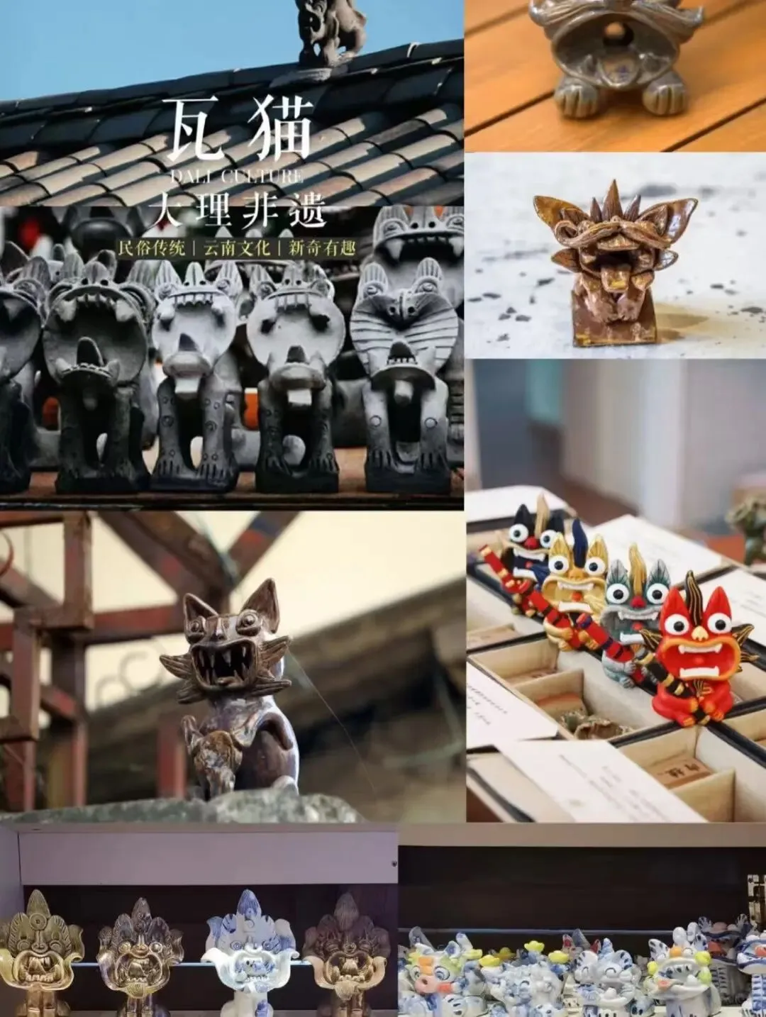 云南民间建新房有安放 “瓦猫” 的独特民俗,多置于房顶、飞檐或大门瓦脊上。瓦猫以陶土制成,造型为张口猫(虎)形。民间认为大门正对庙宇、高房或他人住宅会不吉利、影响家运,因此安放瓦猫镇宅辟邪。