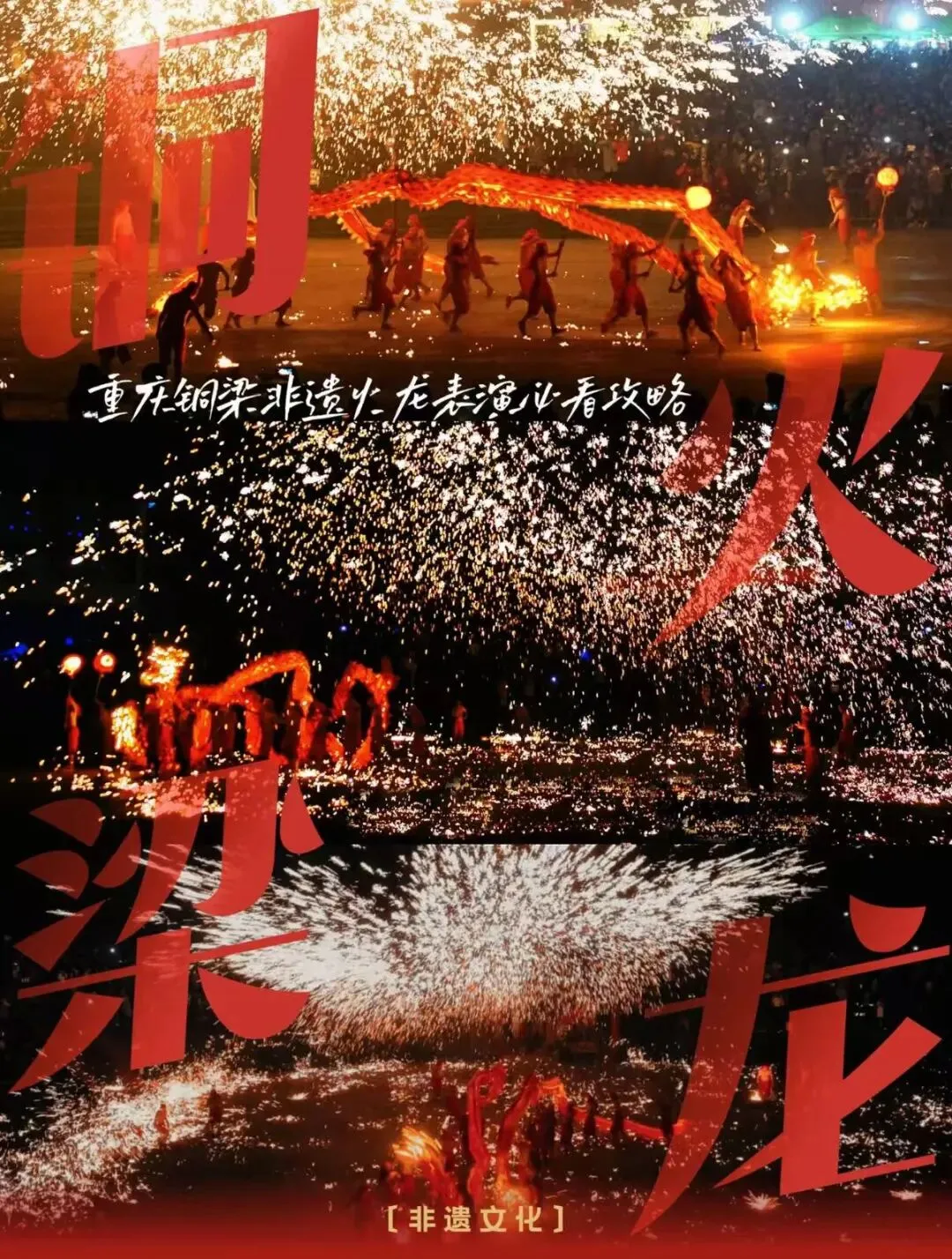 “千万点冲天,火龙飞寰宇,夜放花千树,翱翔天地间”,这是对铜梁火龙最好的写照!铜梁火龙是铜梁龙舞中的精品,自明代传承至今,扎根民间。每逢重大节庆,火龙飞舞,热闹非凡。舞龙手赤膊上阵,铁水溅起漫天金花,配合激昂的打击乐,尽显浓郁乡土气息与生活激情。