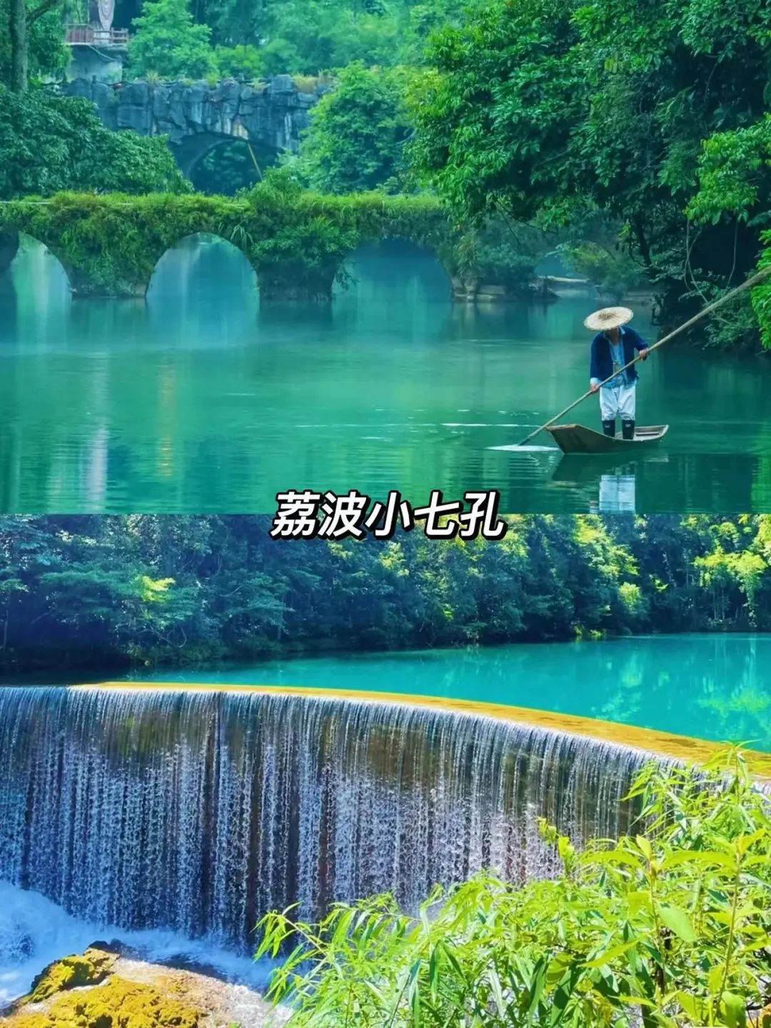 【小七孔景区】:轻柔恬静的涵碧潭,古风依稀的七孔石桥,风流狂泻的拉雅瀑布,潭瀑交错的68 级跌水瀑布,空成华章的响水河,盘根错节龟背山,林溪穿插的水上原始森林。