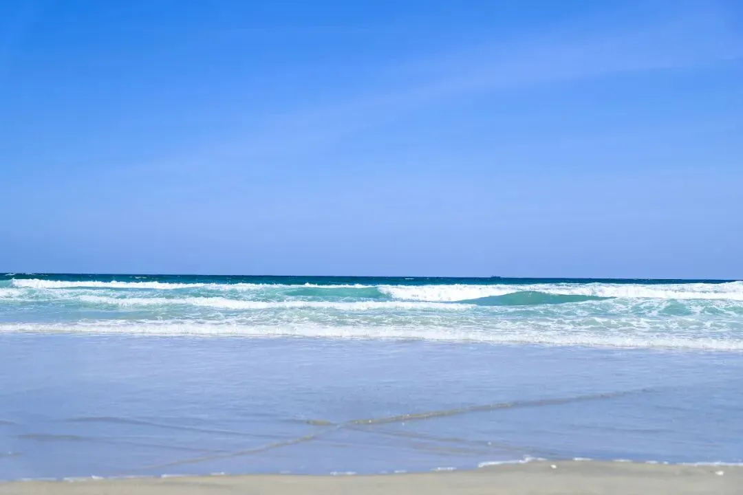 澄澈的蓝天与碧绿的海浪无缝衔接,层层白浪温柔地拍打着细腻的沙滩,像在为你奏响专属的欢迎曲。