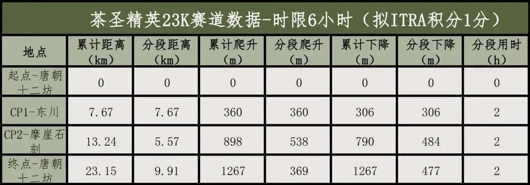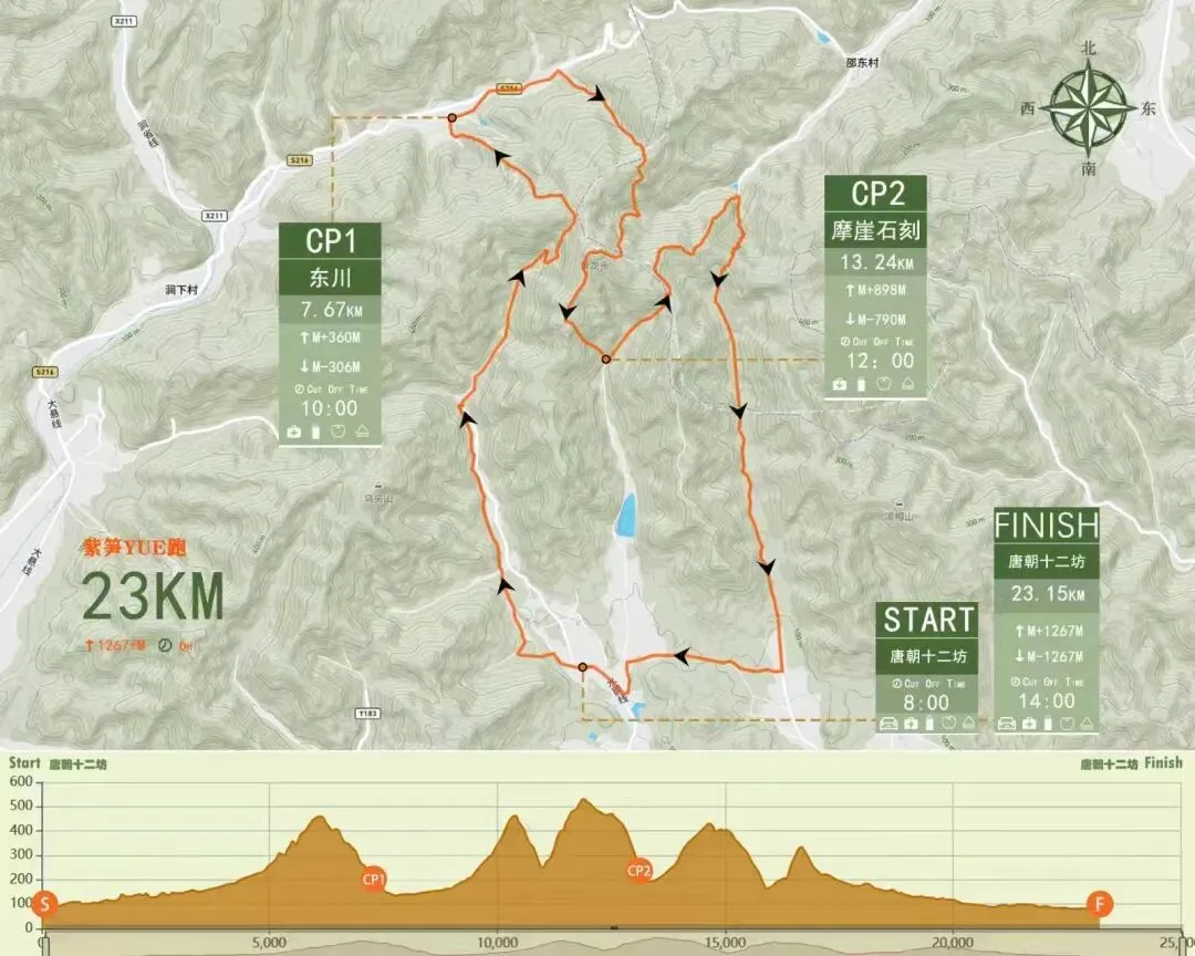 距离23.15KM±,累计爬升1267M±,最高海拔532米,限时6小时;路况含古道30%、自然路面55%、铺装路面15%,ITRA拟认证1分,是越野跑爱好者的实力挑战场!