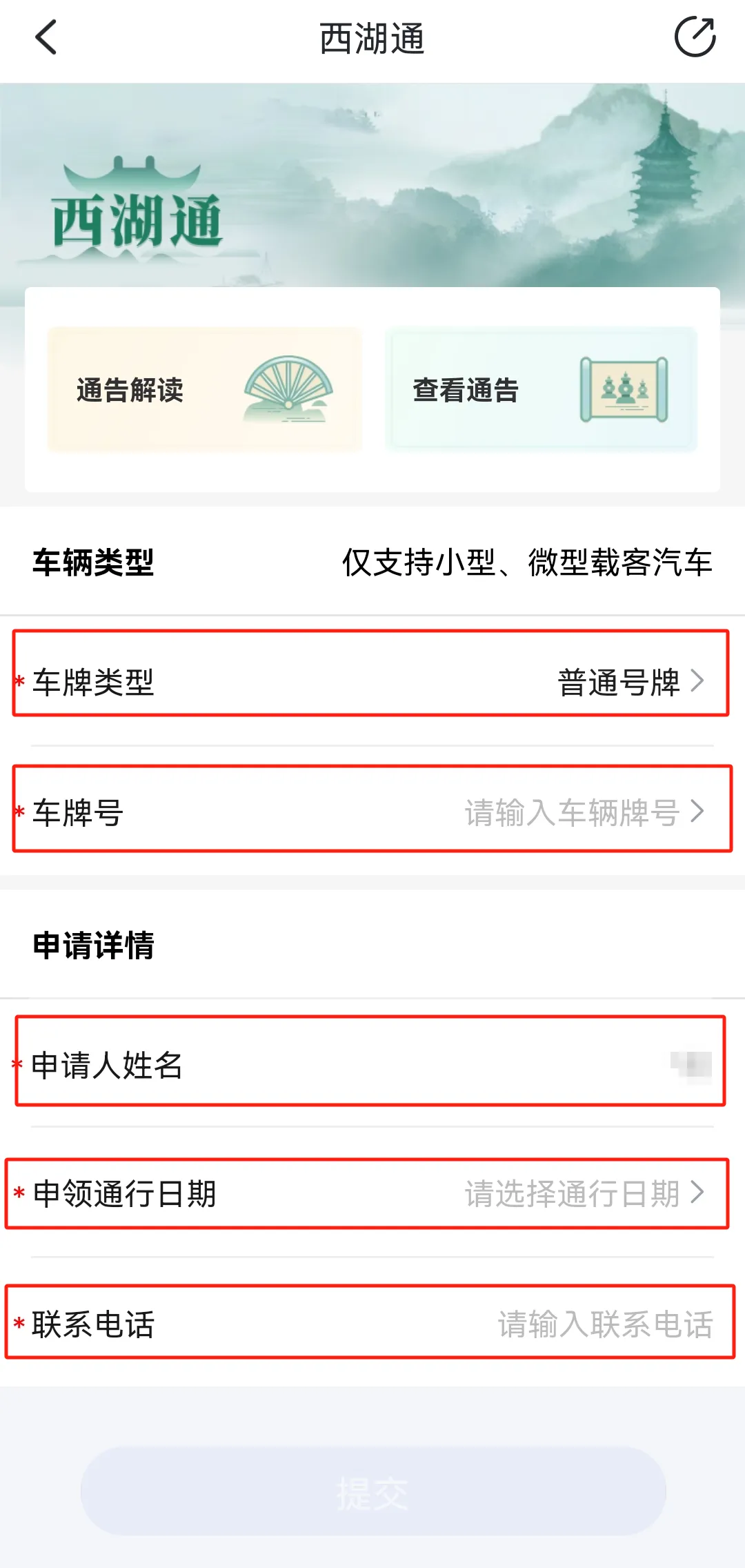 填写页面信息车辆信息、申请人姓名、申领通行日期、联系电话等相关信息,确认无误后点击“提交”。