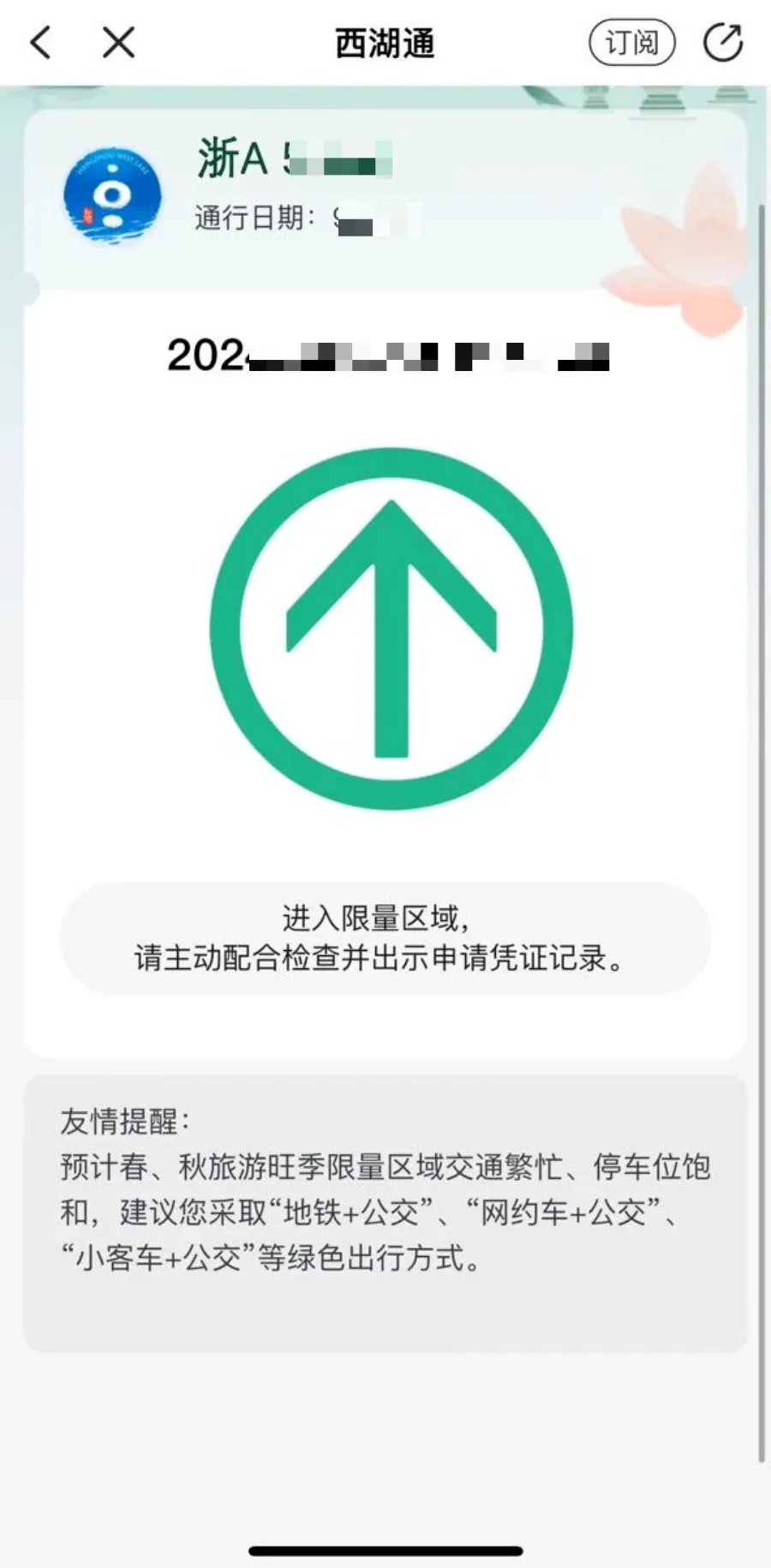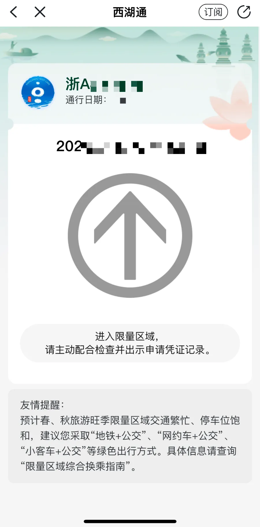 *西湖通在选定日期的当天8:00生效,在当天8:00-17:00受限时段内可使用。