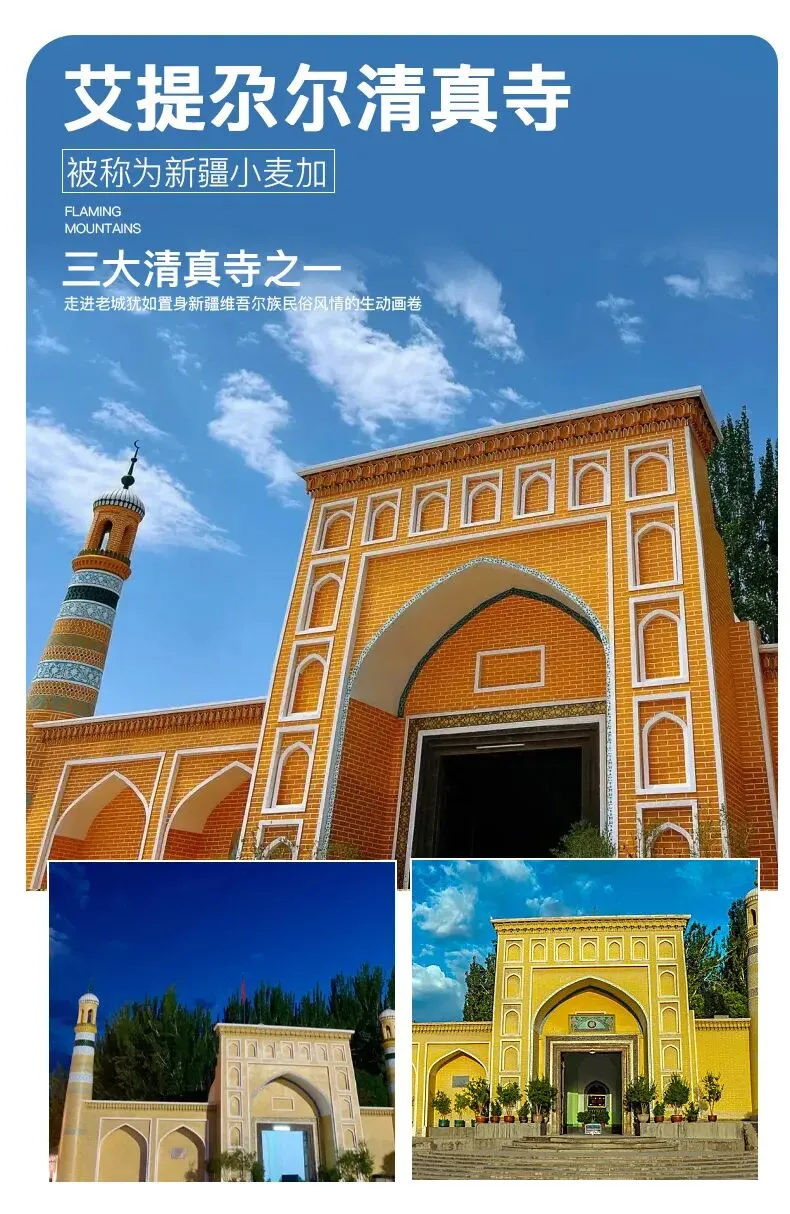 早餐后今天行程开始:乘车前往凝聚喀什历史的【喀什老城开城仪式】,在老城里可以看见传统的维吾尔族建筑,过街楼、半街楼,以及各色雕花建筑。后打卡网红地,同时也是喀什的地域名片,一栋具有维吾尔族风格的两层建筑,也是目前喀什仅存一家的【百年老茶馆】。作为丝绸之路上遗存下来的文化遗迹,老茶馆是喀什的地域文化特色之一。闲时人们在这里品茶食馕、家长里短、八卦天下事,用这种方式传播信息,延续着丝绸之路上的故事。喝茶早已成为老喀什人生活中重要的一部分,《新疆味道》《追风筝的人》拍摄地。参观中国穆斯林影响力最大的清真寺【艾提尕尔清真寺】(节庆活动封闭)被称为新疆小麦加,可同时容纳十万穆斯林做礼拜,与布哈拉、撒马尔罕合称中亚三大清真寺。走进老城犹如置身新疆维吾尔族民俗风情的生动画卷。晚根据火车时间送站,乘火车前往吐鲁番或乌鲁木齐。