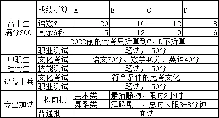考试成绩=文化素质考试分数+职业适应性测试或职业技能测试分数+专业加试分值+赋分项分值,如“考试成绩”超过满分按满分计算