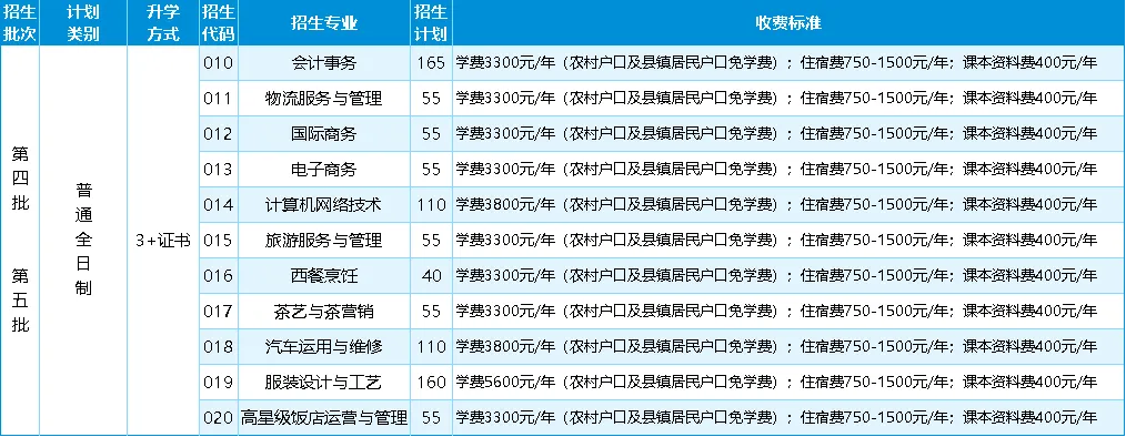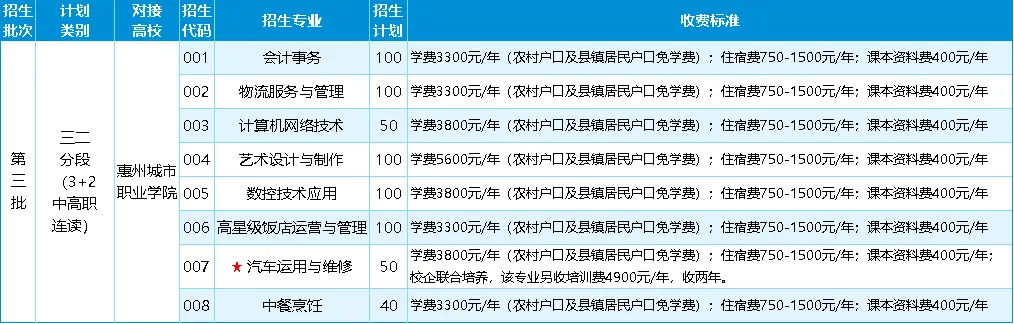 收费标准及注意事项 ★ 农业户口、县镇非农户口、民族自治区学生、城镇家庭特困户、残疾学生享受国家免学费政策。 ★ 财经管理类学费3300元/年,理工类学费3800元/年,艺术类学费5600元/年;住宿费750-1500元/年;教材资料费400元/年。本校按省物价部门核定的收费标准收费,通过广东省财政厅非税收入管理一体化平台扫码缴费,所缴的全部费用直接进入市财政国库。 ★ 第三批次(三二分段)“汽车运用与维修”由学校与企业联合培养,具体培养模式和费用请在志愿填报前咨询学校招生办公室。 ★ 技能考证、“3+证书”培养模式和费用请咨询学校招生办公室。 ★ 最终招生计划、志愿填报、招生录取规则按《惠州市2025年高中阶段学校招生报考指南》执行。 ★ 其他招生资讯、人才培养模式、毕业升学等情况可预约进校咨询。 图文来源:网络 免责声明:本图文素材仅供免费学习交流之用,版权归原作者所有,若有侵权,请联系我们删除。