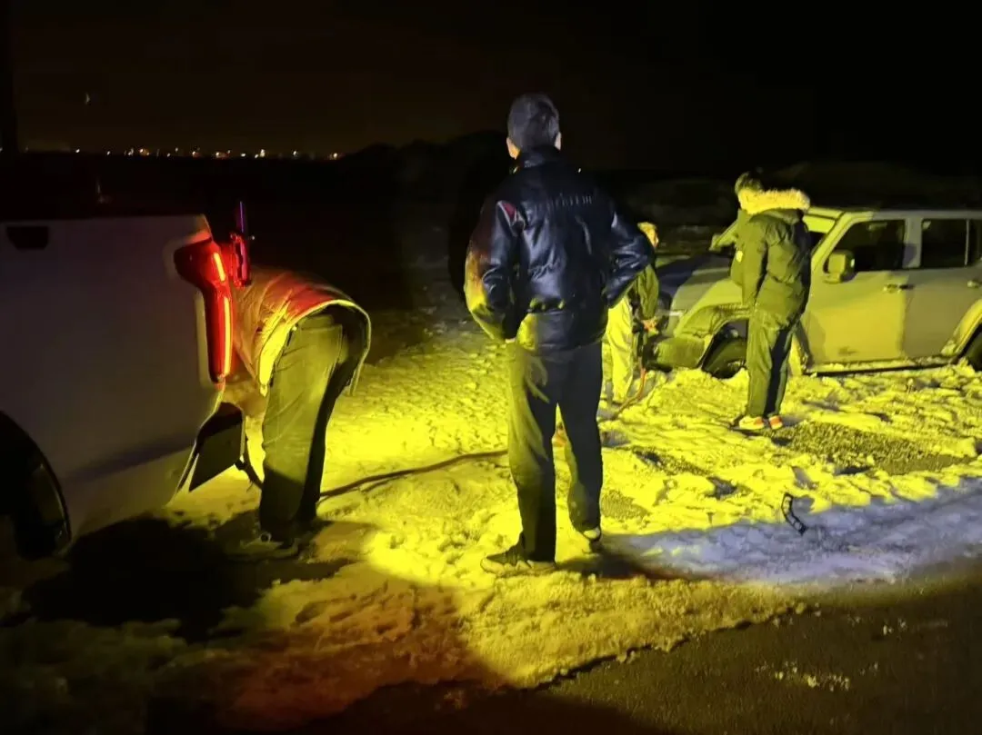当日凌晨01:14,橄榄绿乌苏应急救援队接到求助信息:1辆坦克300越野车与1辆皮卡车在景区内行驶时,因积雪过深导致轮胎深陷雪中,无法正常移动,其中皮卡车还出现了轮胎脱圈的故障,驾乘人员陷入困境,急需救援。接到求助后,救援队员张亦弛、康伟太、房超得不敢耽搁,第一时间携带千斤顶、气泵等专业救援工具,火速驱车赶往现场。